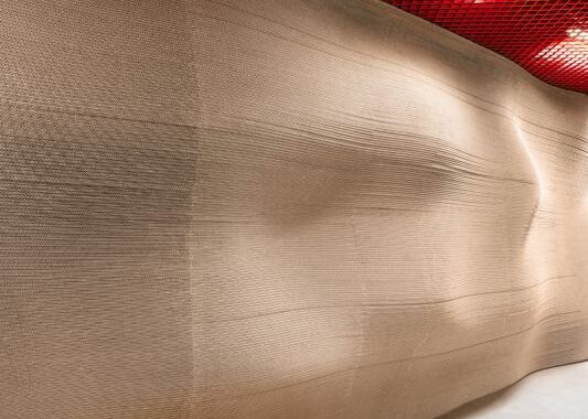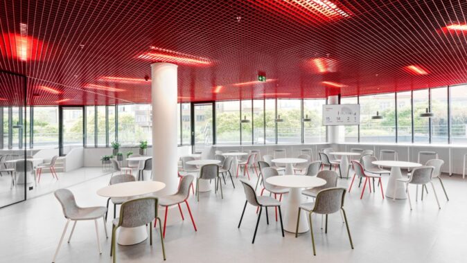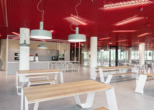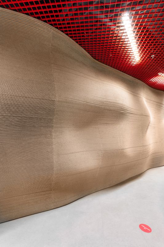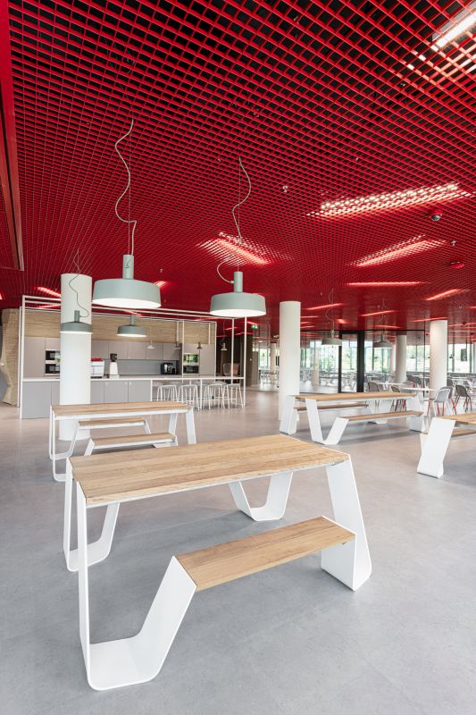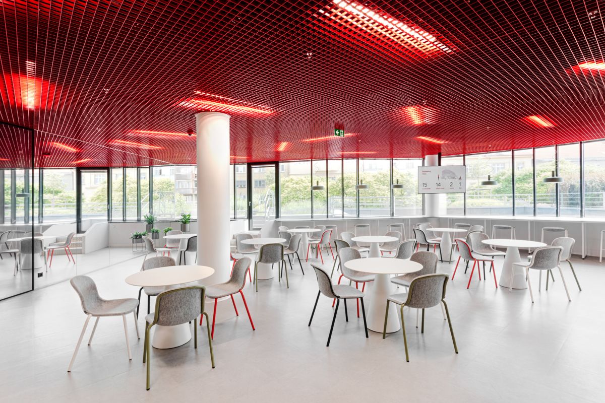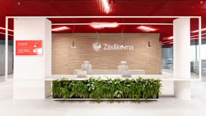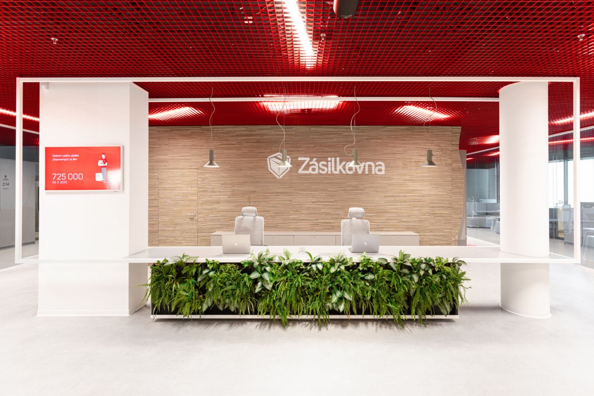 Jako další dominantní prvek celých prostor je zde pak červený hliníkový strop, nad kterým jsou taženy rozvody a umístěna prachotěsná LED svítidla, evokující logistické pozadí firmy. Pro potenciální budoucí úpravy ovšem zůstane strop přístupný a díky kazetám výrazně flexibilní. Barva stropu přímo odkazuje na korporátní identitu Zásilkovny, čímž se nám přirozenou cestou podařilo docílit signifikantního brandingu v celých interiérech firmy. Klíčové ovšem jsou také ostatní materiály, které v projektu používáme. Jejich kvality opět akcentují zelenou politiku. Jedná se totiž o recykláty, a to ve většině dostupných produktů. Od pracovních desek (deskový materiál z recyklovaného a vysokotlakem lisovaného papíru), přes lisované desky z dřevěných vláken, známé pod názvem Valchromat, až po řešení sedacího nábytku, který je navržen z recyklovaných plastů. V případě čalouněného provedení se jedná o ekologické látky, tedy materiály z recyklovaného PET. Na každém kroku se tak zaměstnanci či návštěvníci mohou setkávat s ekologickými produkty použitými systematicky ve všech prostorách interiérů. Ty tak nejen obohacují prostor svou specifickou estetikou a vybranou strukturou, ale zároveň mohou edukovat ty, kteří projeví o dané řešení zájem. Jde o vynikající marketingový nástroj.