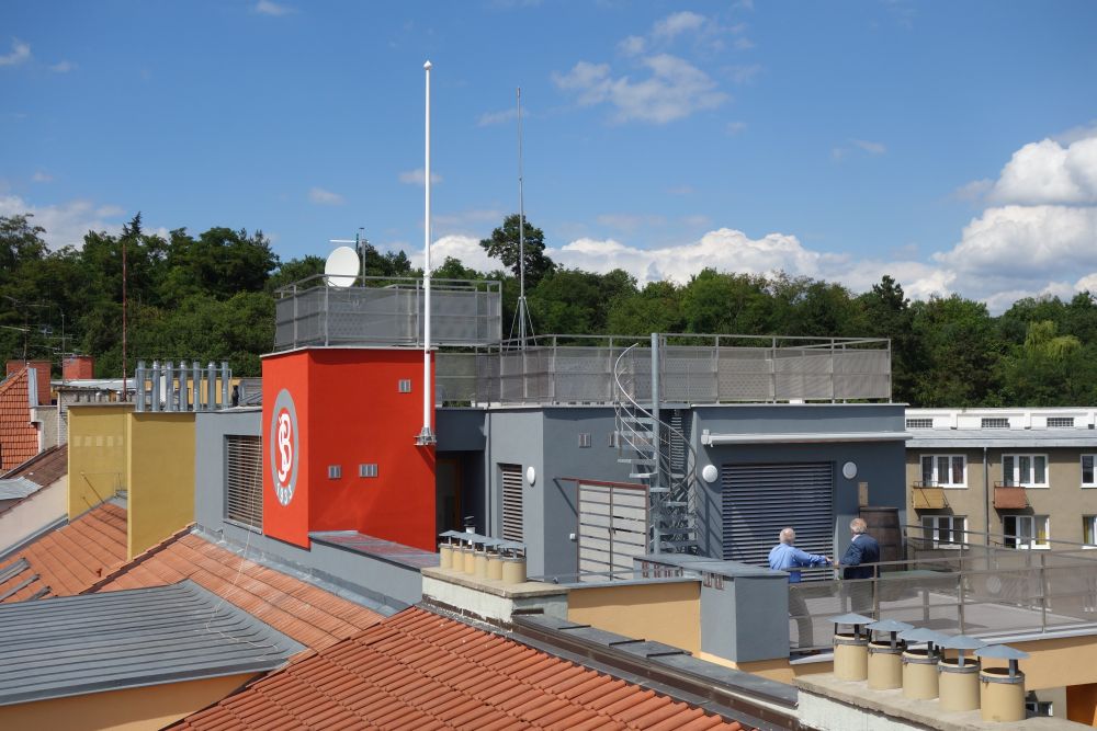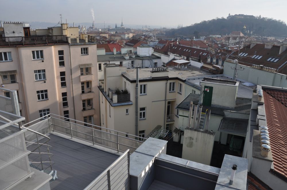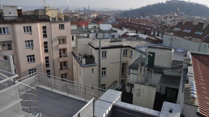 nová střešní nástavba. Její hmotové, materiálové a konstrukční řešení na dům navazuje