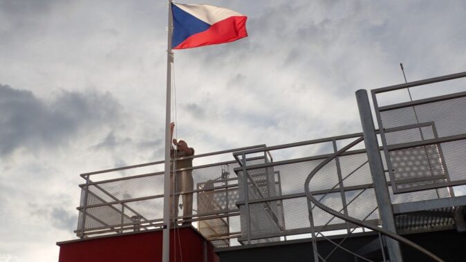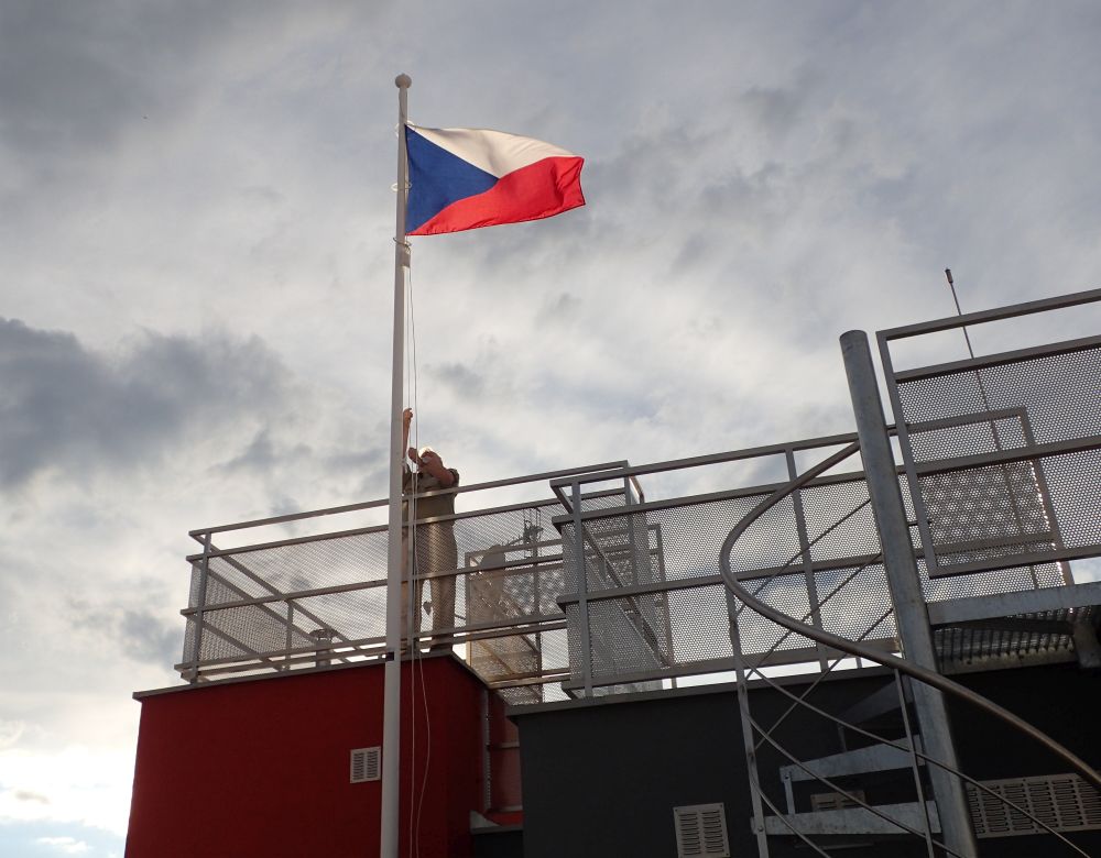schodiště i kapitánský můstek se stožárem pro vlajku.