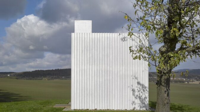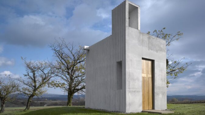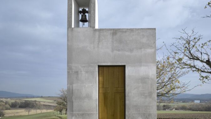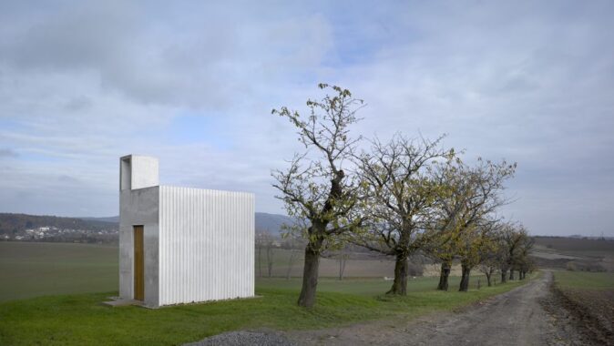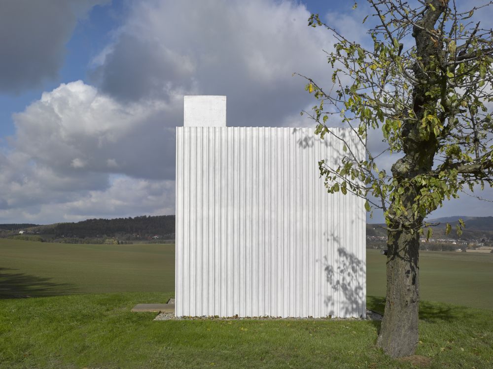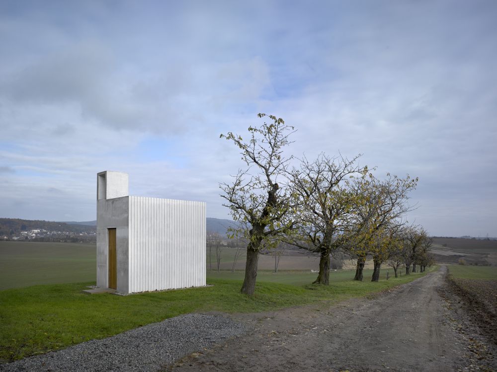 Do krajiny je vevázána svojí polohou na hřebenu – avšak nikoli na vrcholu – svahu na hraně lesa, zapojením do rytmu třešňové aleje při polní cestě, svojí osou hledící na východ na obec Osek a k vrchu Hostýnu. Vůči přírodě vystupuje přesnou geometrií svého těla určenou Le Corbusierovým Modulorem, jeho abstrahující bílou barvou a materialitou betonu šalovaného do kmenů stromů. Vertikální kanelování stavby dané otisky pečlivě řazených kmenů bednění lze vnímat jako motiv zasvěcený přírodě, avšak stejně tak jako základní motiv lidské kultury a odvěký sakrální symbol. Roseta východní fasády je „zasklena“ čirými a modrými skleněnými „kameny“, odpadem ze sklářských pánví při tavení skla, nazývanému skláři harklos.