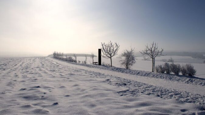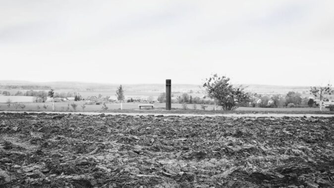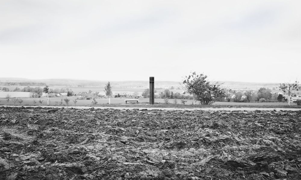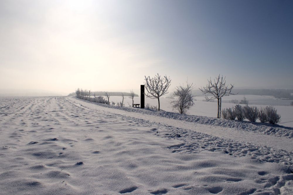 Lhoty lemuje mladé stromořadí, výhled na Železné hory je kolorován sluncem