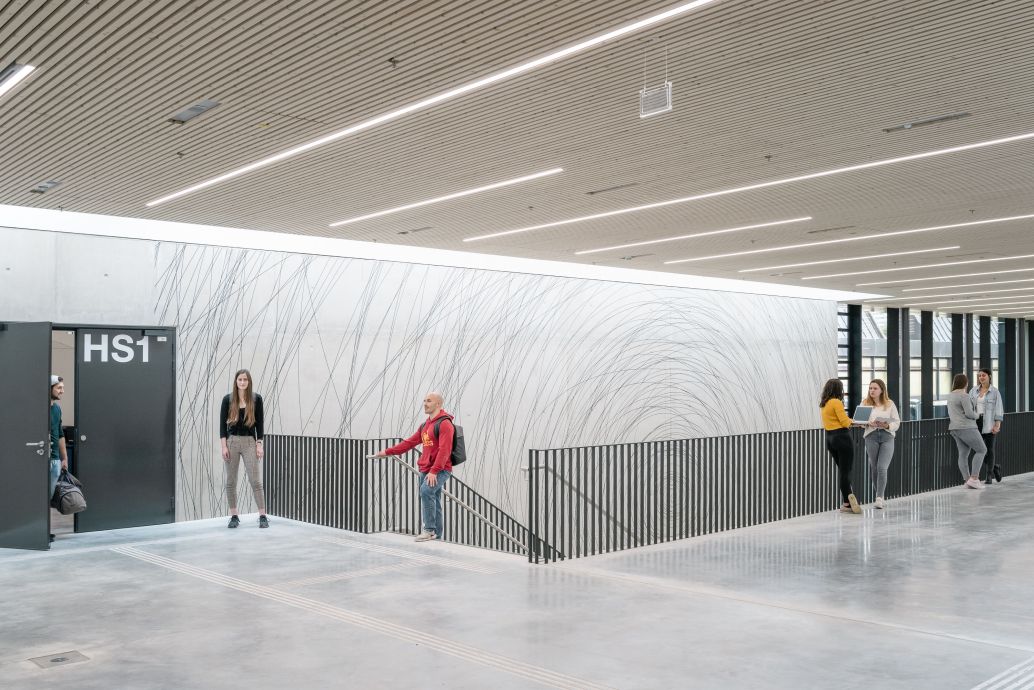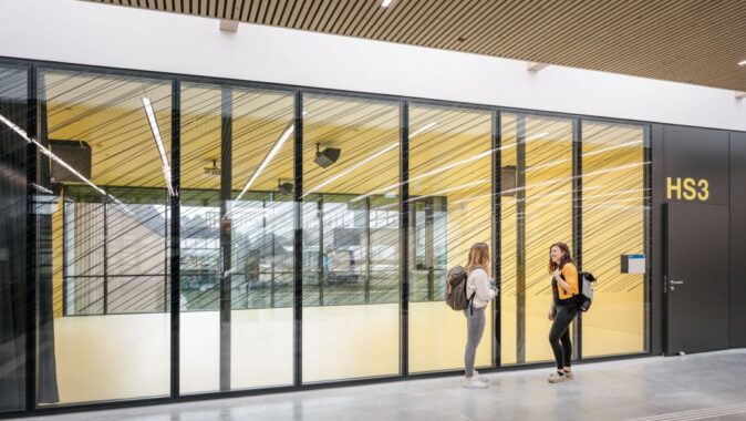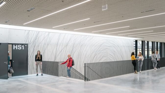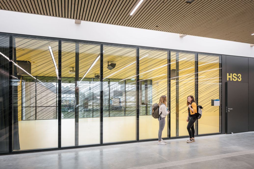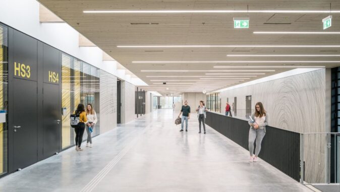 Součástí dřevostavby v kampusu TUM je i velkorysé prosklení, které umožňuje studentům být neustále v kontaktu, což bylo v návrhu rovněž důležité. Atria zasahující hluboko do středu budovy přinášejí přirozené světlo a ozvláštňují chodby. Zároveň nabízejí místo setkávání i perfektní hlediště, odkud je možné sledovat sportovní utkání či tréninky. V kampusu samozřejmě nechybí ani venkovní plochy s různými sportovišti, které však slouží a na pohled i připomínají klasický park. Centrální přístupová osa, ztužující schodišťová jádra, přednáškový sál a lezecký sál i suterén jsou navrženy z železobetonové konstrukce.