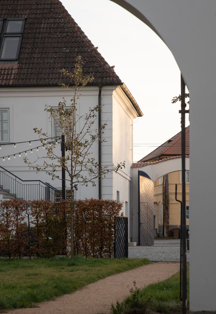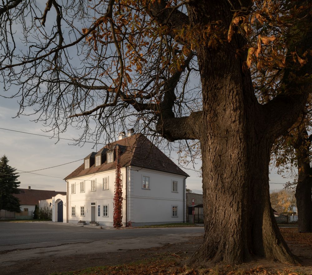 Adaptace historické budovy statku na kavárnu s dvorem navazuje na přilehlý jezdecký areál. Hlavní děj se odehrává za vraty, kde poloveřejný prostor supluje roli nefunkční návsi. Dvůr je vytyčen žulovou dlažbou, v jejím těžišti je zasazena vzrostlá lípa, kolem které se odehrává neformální život kavárny. To vše na pozadí koňských stájí, které dokreslují atmosféru venkovského stavení.