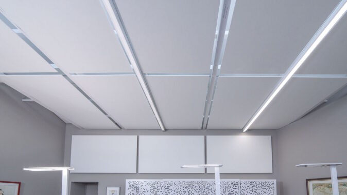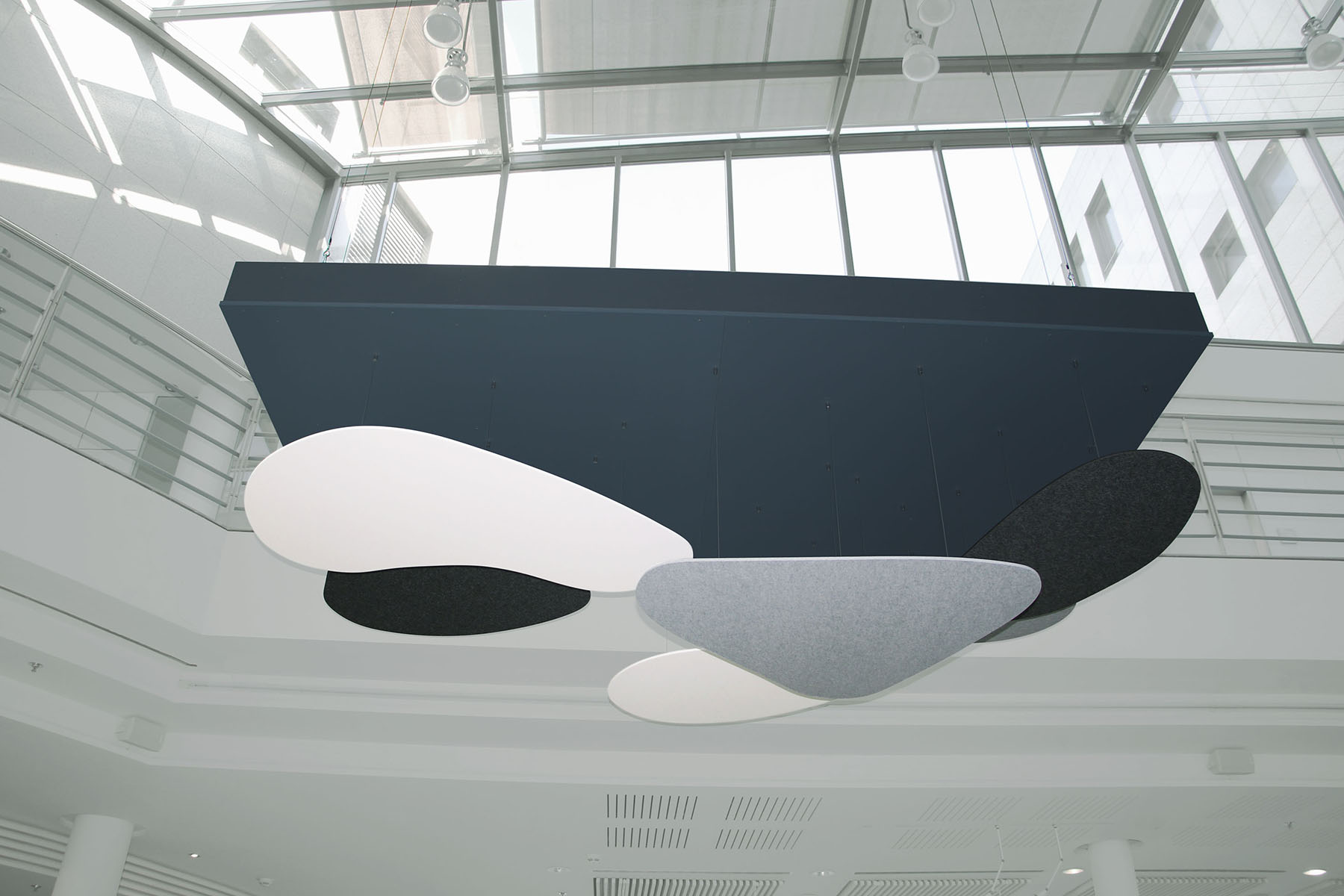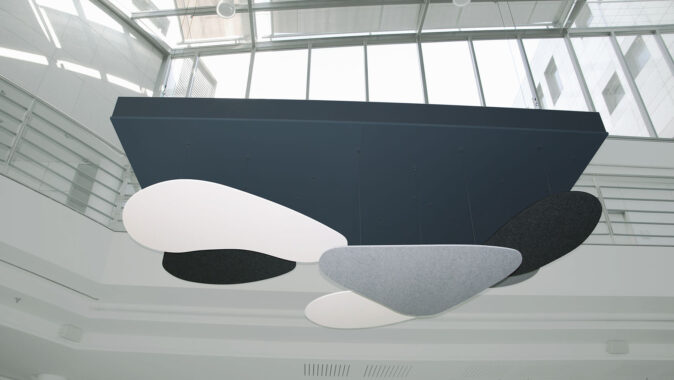 Dodatečně aplikovatelný absorbér hluku Knauf Cleaneo Single Smart vylepšuje akustiku místnosti a vhodně doplňuje akustické sádrokartonové desky Knauf i akustické děrované desky Knauf Cleaneo.