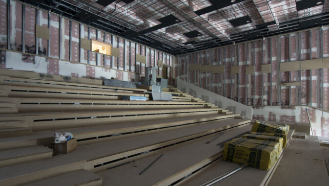 nejdůležitější akustická příčka mezi sály a vnitřními místnostmi je 600 mm