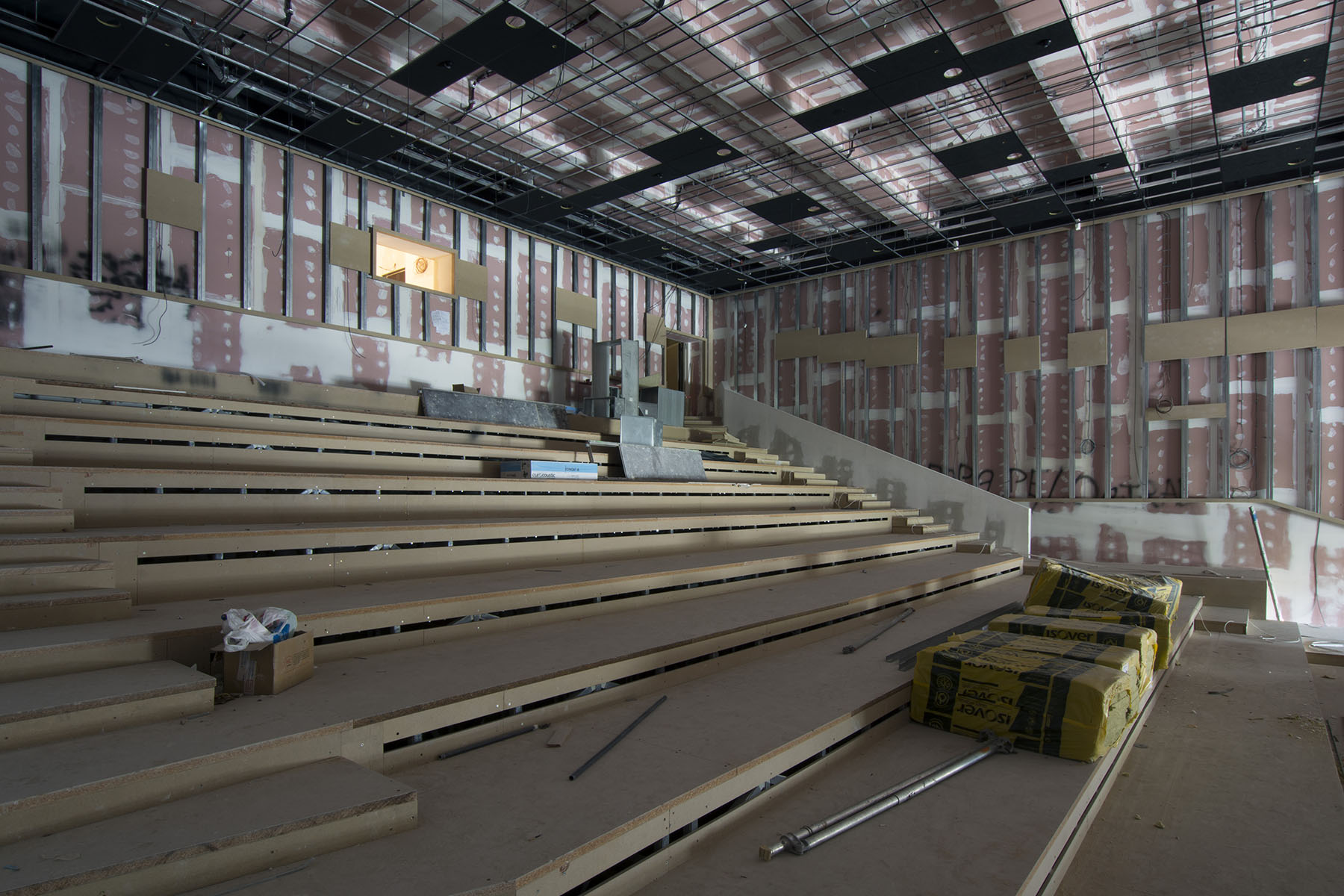 Knauf RED Piano 2 x 15 mm + 1 x 18 mm ze strany kinosálu. Dvojřadá konstrukce
