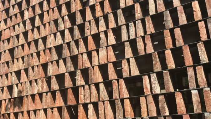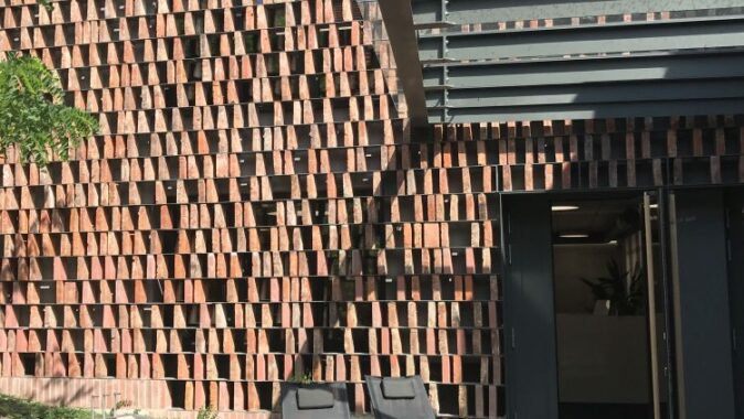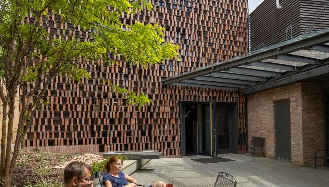 budovy, jejíž měřítko a vzhled neomítnuté cihelné dvoupodlažní stavby s mírnou