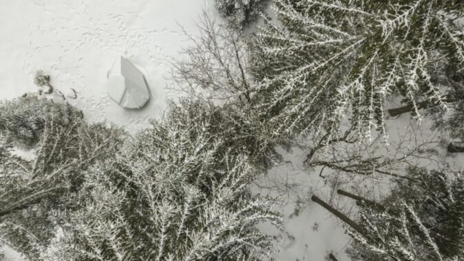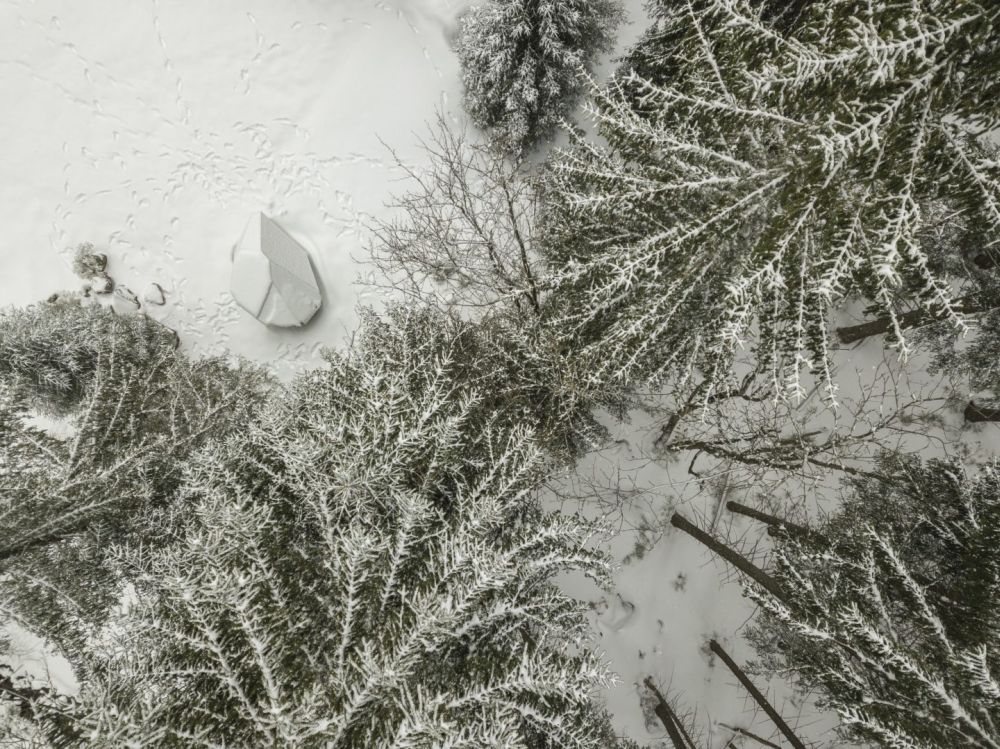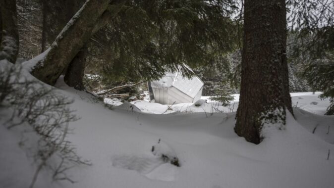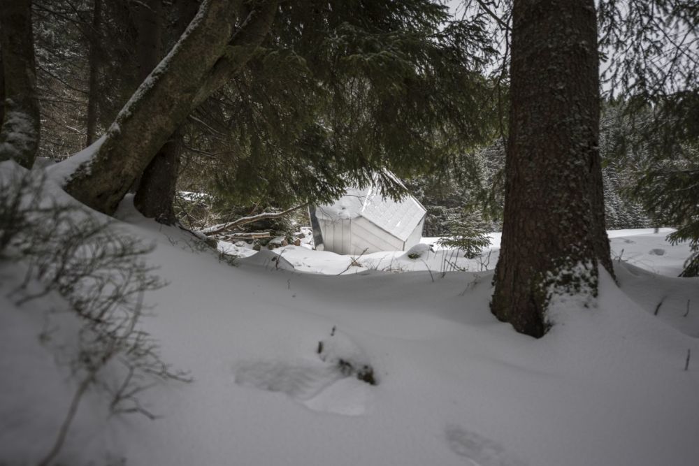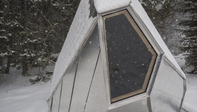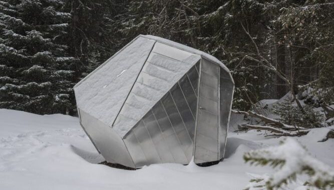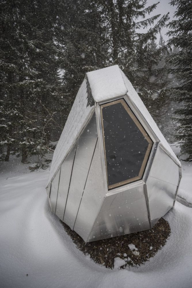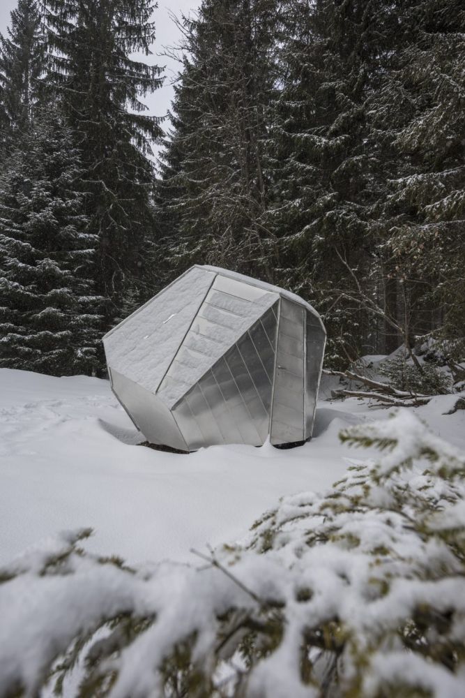 Nepravidelná, ale kompaktní struktura útulny vytváří pocit bezpečí a úkrytu, světlé dřevo v interiéru kontrastuje s plechovým opláštěním a špatným počasím. Tvar útulny vychází z Voroného diagramu. Principem bylo vytvoření kolmé přímky na spojnici dvou bodů tak, aby při posunu bodu na této kolmici byla její vzdálenost do počátečních bodů vždy stejná. Vytvořením několika bodů vznikne tolik kolmic, až společně vytvoří uzavřené plochy.