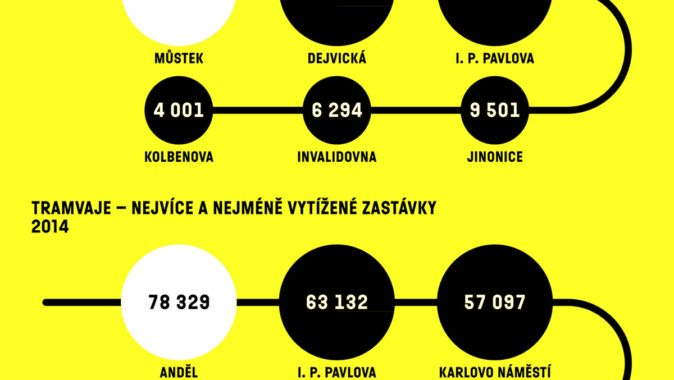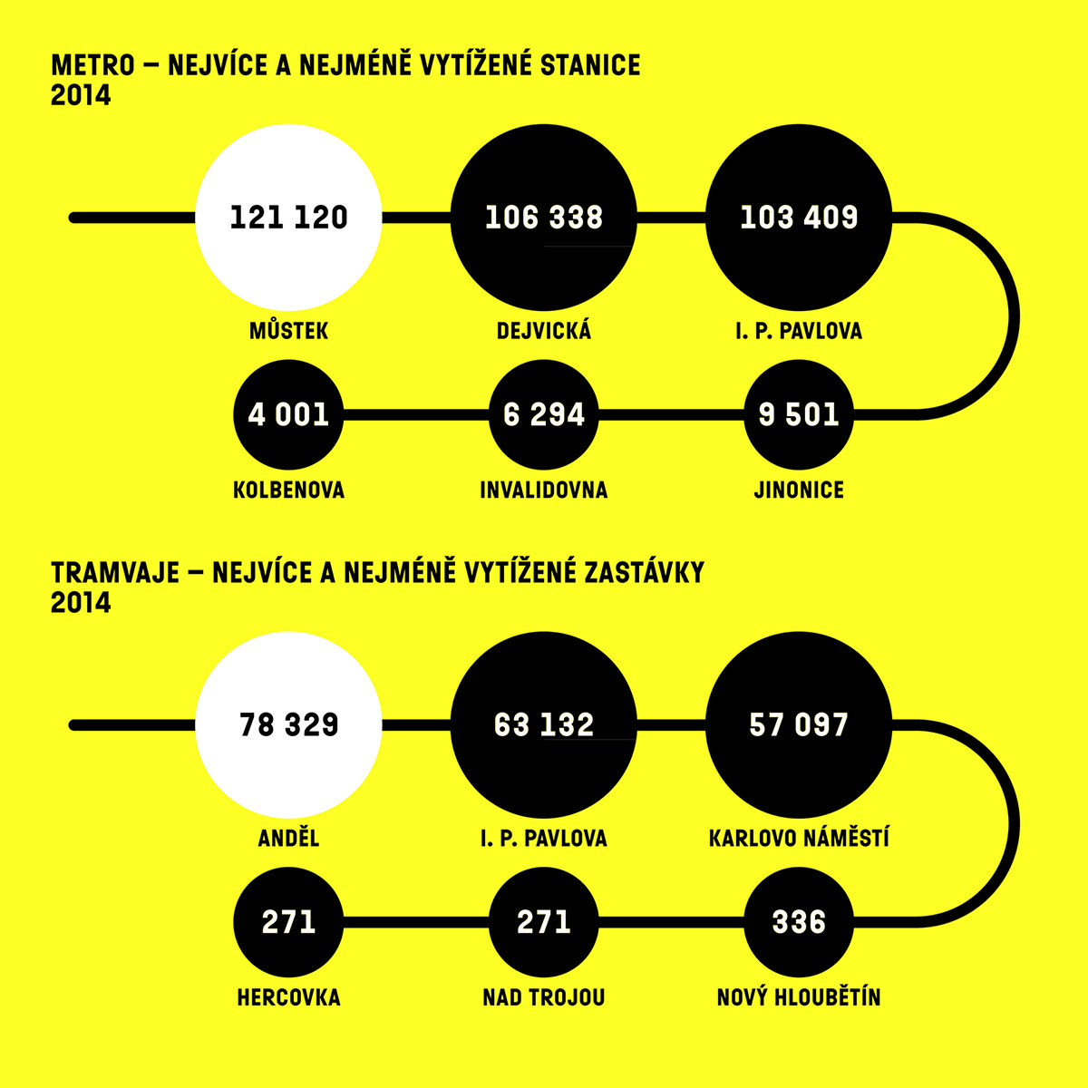 V roce 2014 byla nejvíce vytížena stanice metra Můstek a naopak nejméně stanice