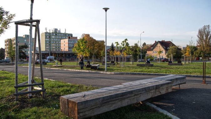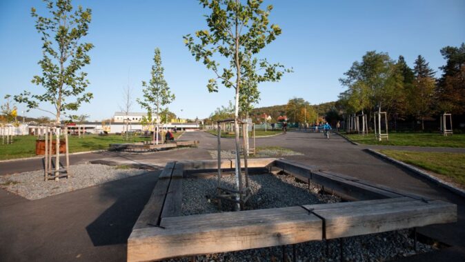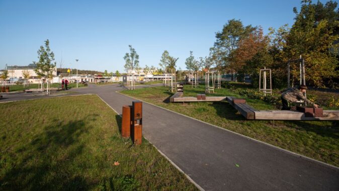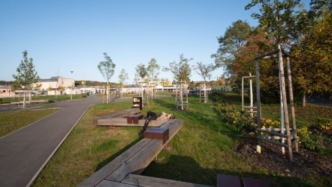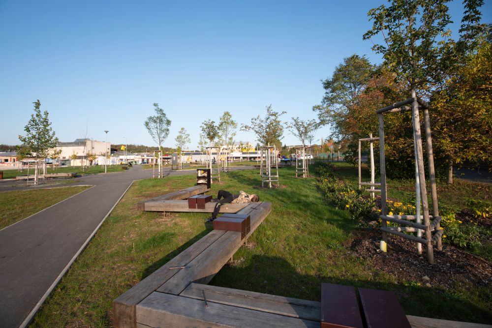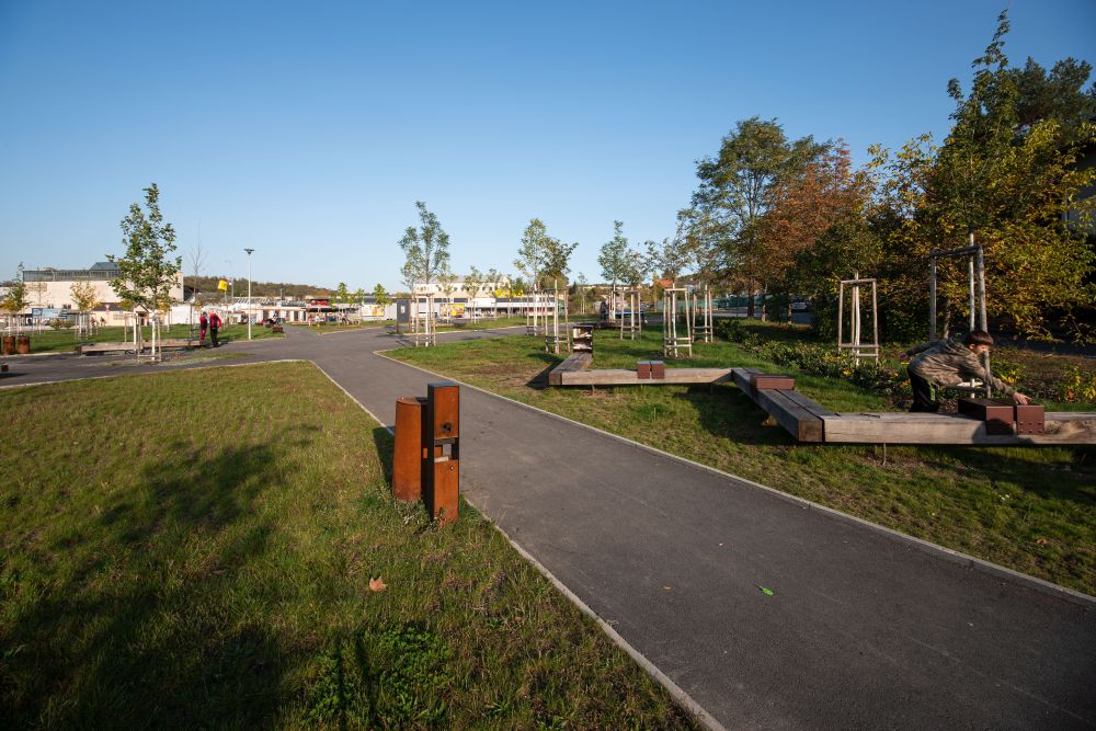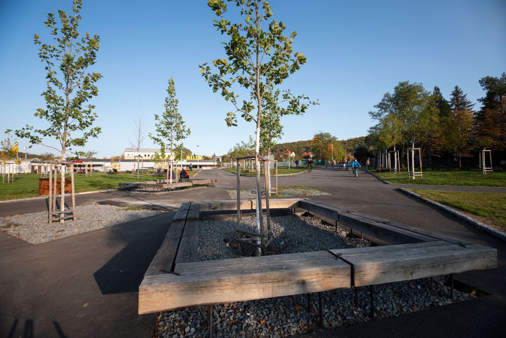 plochou, v jižní části ze sídliště na autobusovou zastávku. Jeho centrální