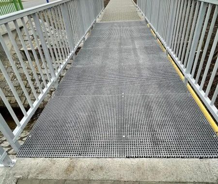 Pochozí rošty s velikostí ok 10 x 10 mm jsou bezpečné pro chůzi nejen osob, ale i psů. Protiskluzový povrch roštů zajišťuje vysokou bezpečnost i při dešti nebo náledí. Před instalací byla lávka posuzována také na požadovanou zátěž a způsob uložení.