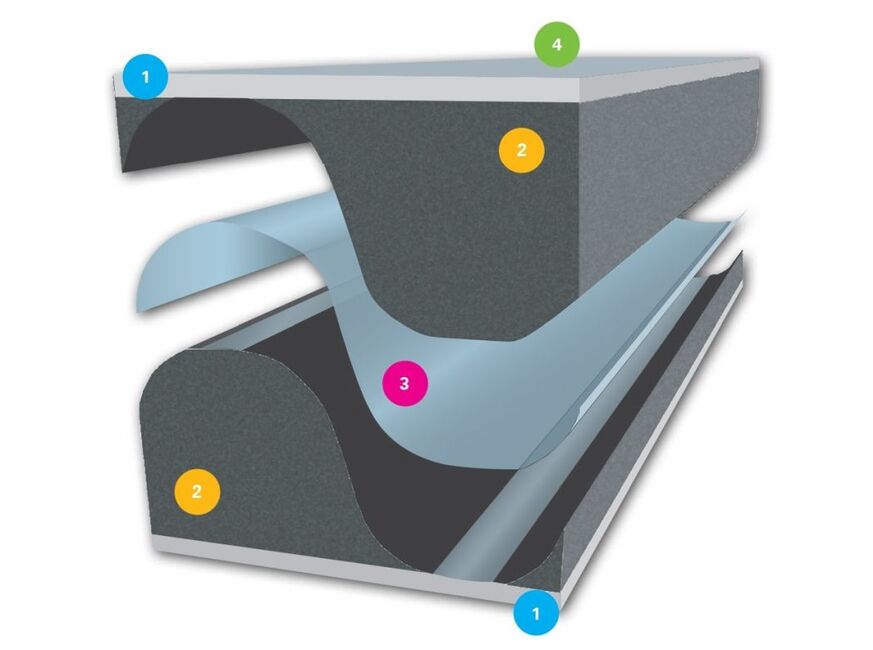 Komprimační páska illmod Trio 1050 vůbec poprvé vsadila na sendvičovou architekturu: středovou pásku antracitové barvy z vnější strany obklopují a doplňují subtilnější pásky šedé, které jsou z jiného typu polyuretanu. Do středového impregnovaného pěnového materiálu s otevřenou strukturou buněk byla zaintegrována membrána s funkcí proměnlivé propustnosti vlhkosti. Klíčovou úlohou membrány, která je v pásce umístěna ve vodorovné vlně, je změna vlastní difúzní propustnosti v závislosti na okolní vlhkosti. V případě vysoké vzdušné vlhkosti blízko membrány se její struktura otevírá a vlhkost odchází velmi snadno ven. A naopak, pokud je v blízkosti membrány materiál suchý, membrána si ponechává vyšší těsnost a prostup vlhkosti zpomaluje. Výsledkem je, zjednodušeně řečeno, neustálé optimalizované vysychání spáry v průběhu celého roku. Navíc celá středová část pásky je plně impregnovaná, což zaručuje vysokou vodotěsnost proti hnanému dešti do tlaku 1050 Pa, UV stabilitu a v kombinaci s integrovanou membránou především skoro nulovou spárovou průvzdušnost pásky. Minimální spárová průvzdušnost detailů je často požadována staviteli pasivních a nízkoenergetických domů, kteří rádi nechávají své domy podrobit zkoušce těsnosti obálky, tedy blower door testu.