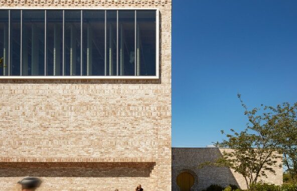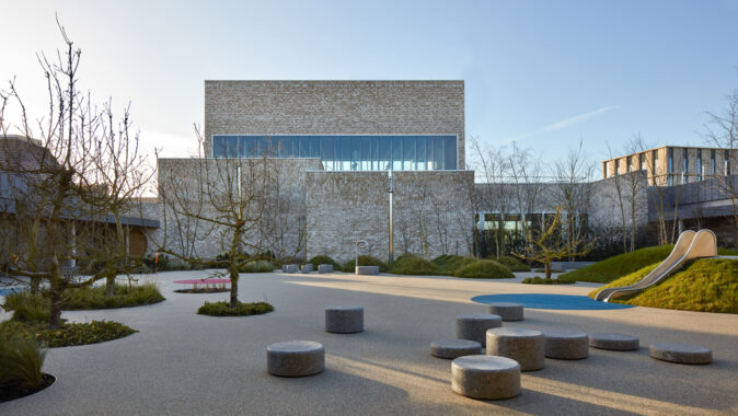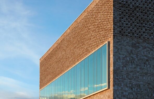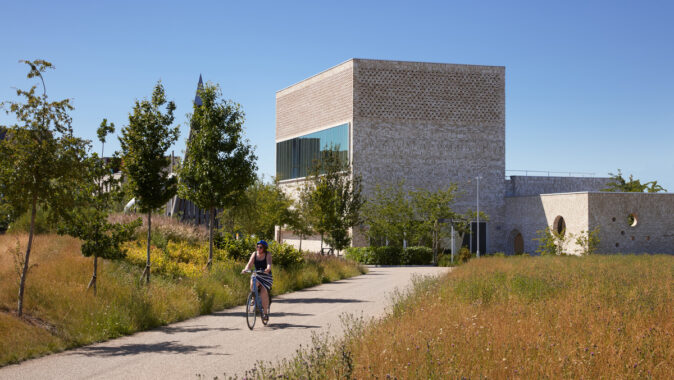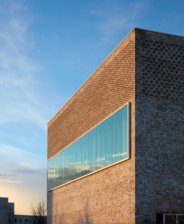 terasou na západě. Budova tvoří významný bod nové čtvrti, viditelný ze všech