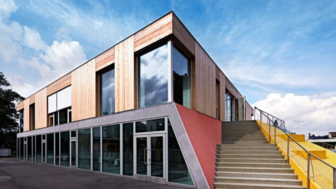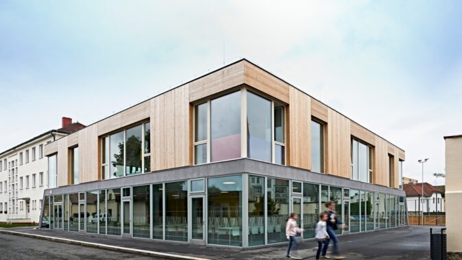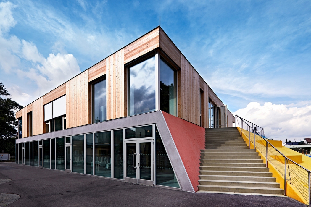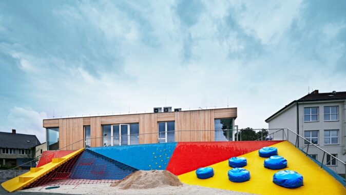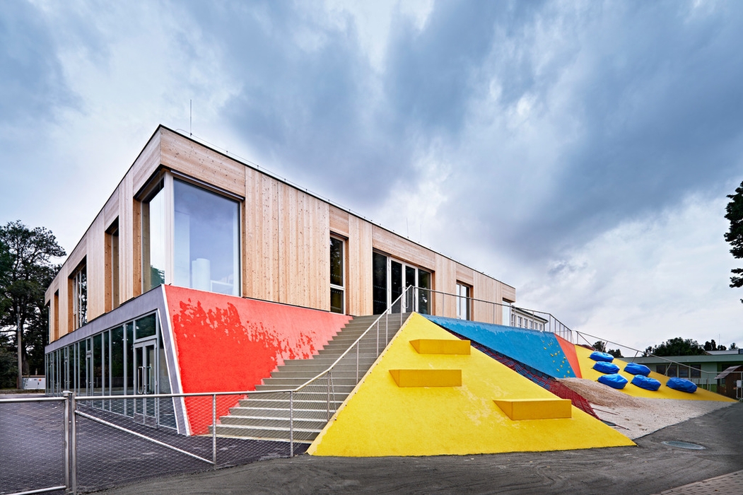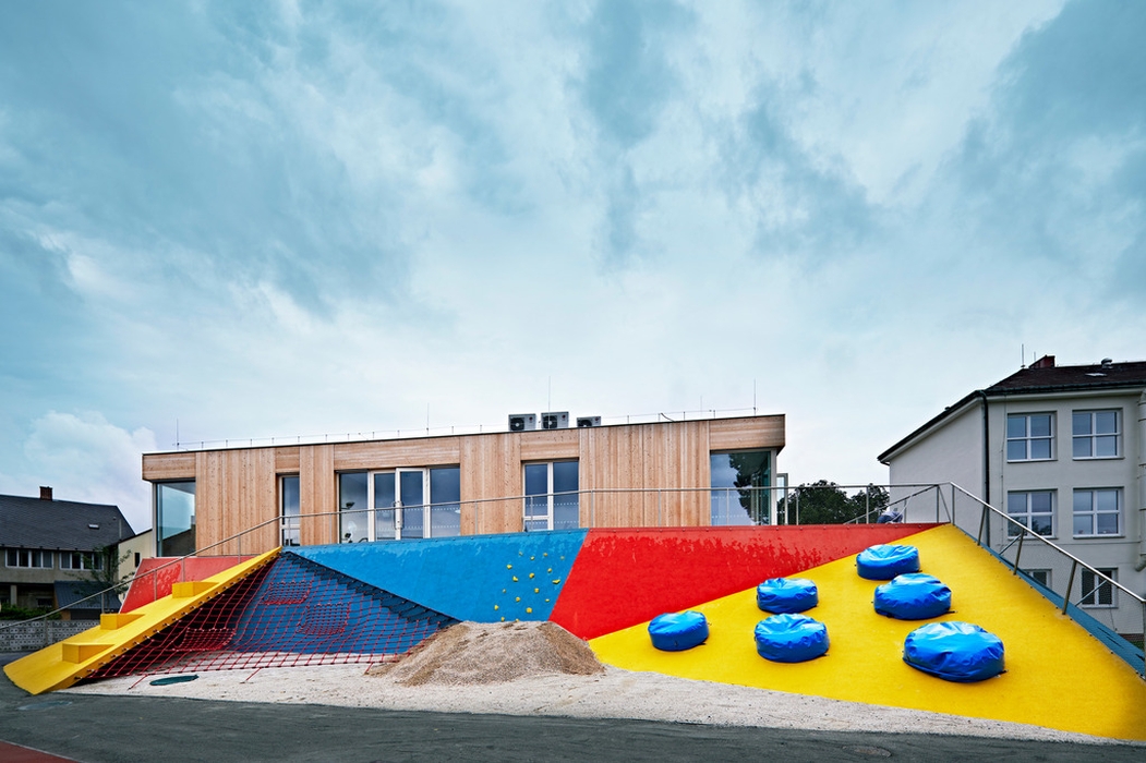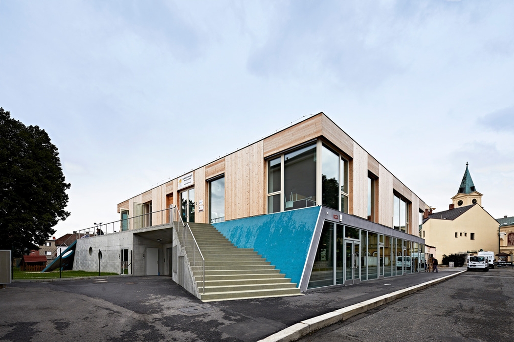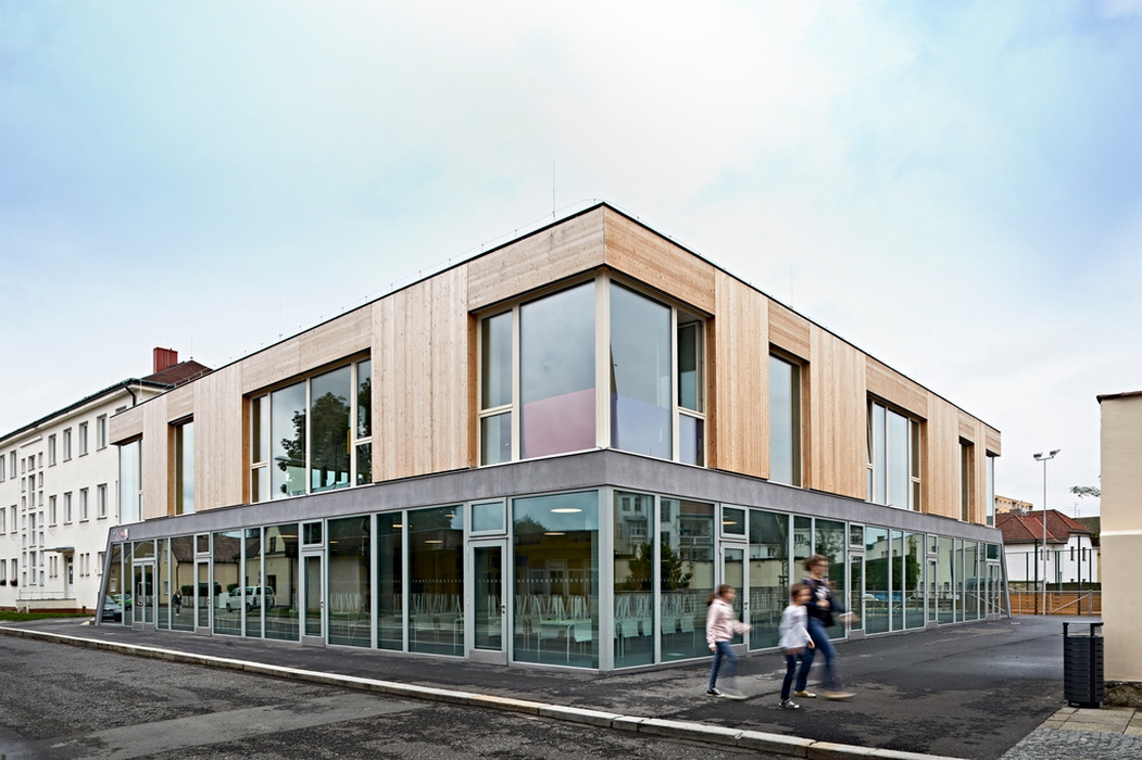 Nová budova doplňuje polopropustnou hranici mezi veřejným prostorem ulice Mírové a poloveřejným prostorem dvora základní školy a zahrady mateřské školy. Dům je umístěn čelem na hranici původní předzahrádky, neboť byl školní dvůr stísněný a veřejný prostor naopak relativně rozsáhlý (i díky otevření pozemku rušeného objektu staré jídelny). Nový dům není připojen ke starším objektům, stojí samostatně. Podporuje tak propustnost adekvátní vnitrobloku. Volností a umístěním domu je zdůrazněna i jeho centrální poloha a význam v celém novém městském parku. Přístupností a otevřeností parteru umožňuje velkou variabilitu využití. Toto řešení, s uličkami po stranách domu, je typické pro historickou zástavbu náměstí Mnichova Hradiště.