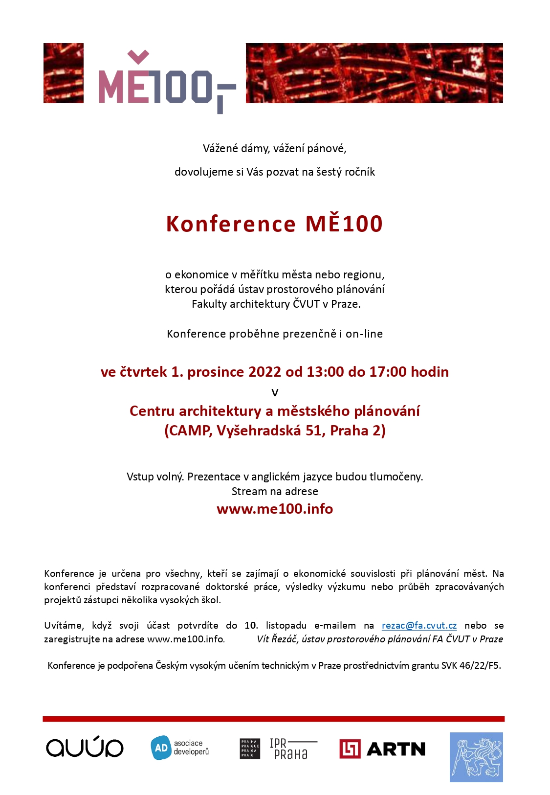 Zveme na šestý ročník konference MĚ100 o ekonomice v měřítku města nebo regionu, kterou pořádá ústav prostorového plánování Fakulty architektury ČVUT v Praze. Konference proběhne prezenčně i online ve čtvrtek 1. prosince 2022 od 13:00 do 17:00 v Centru architektury a městského plánování, Vyšehradská 51, Praha 2.
