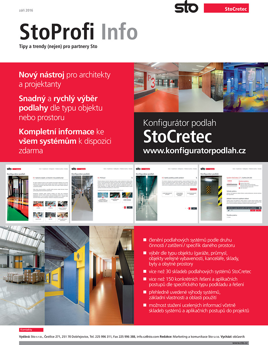 Společnost Sto vytvořila nové webové stránky, které ocení zejména architekti a projektanti při navrhovaní podlahových systémů do většiny prostorů a objektů. Na webu www.konfiguratorpodlah.cz naleznete on-line aplikaci, s jejíž pomocí snadno a rychle vyberete správný typ podlahy.