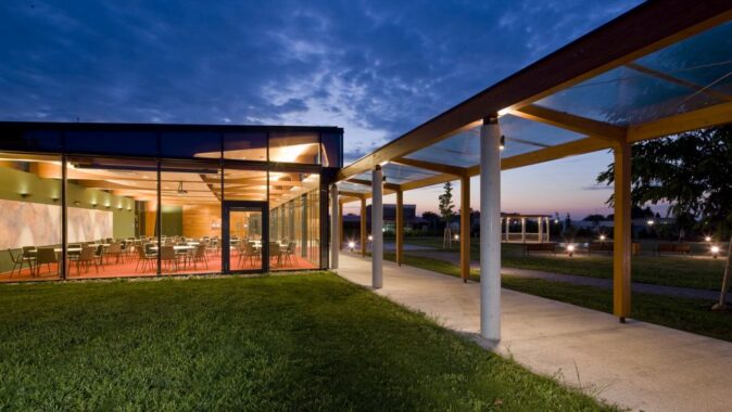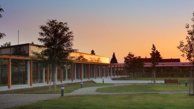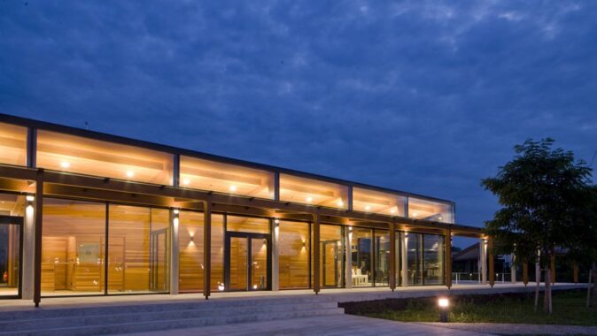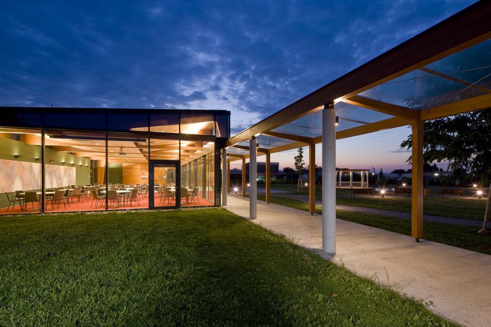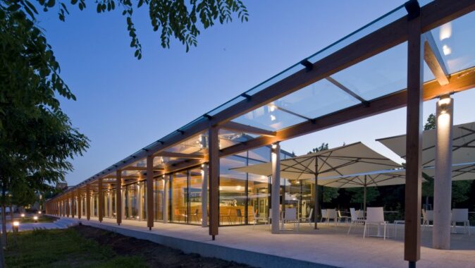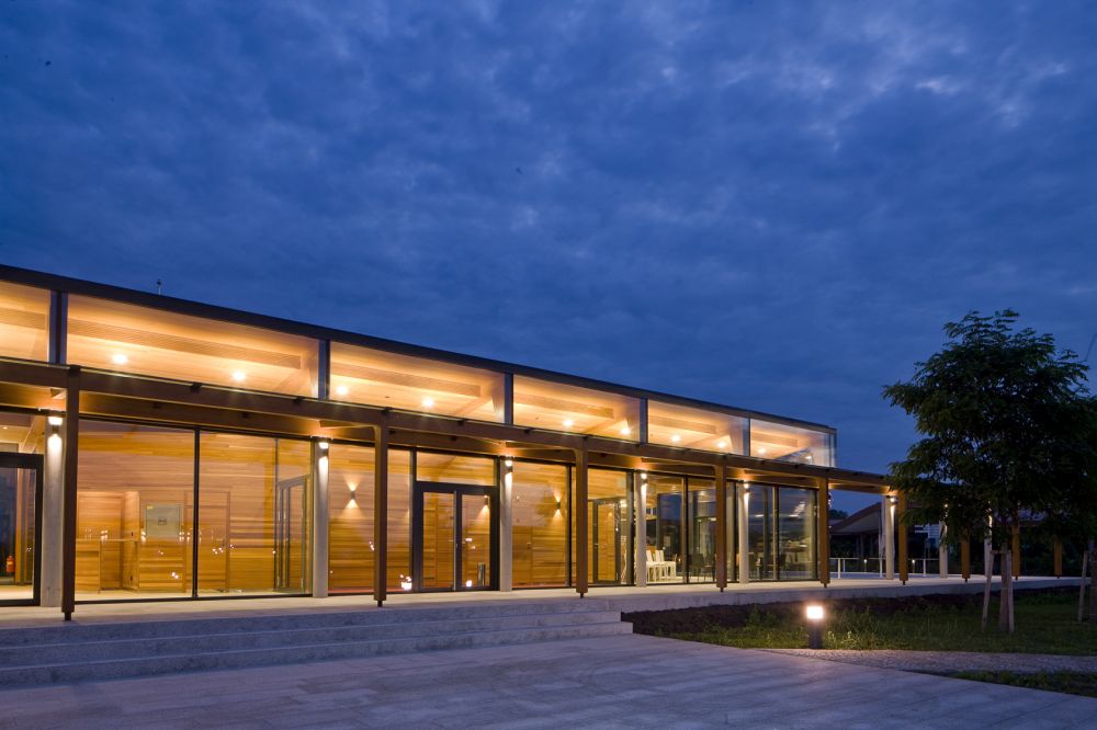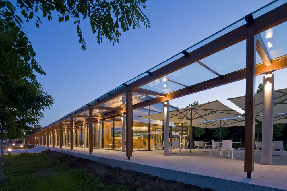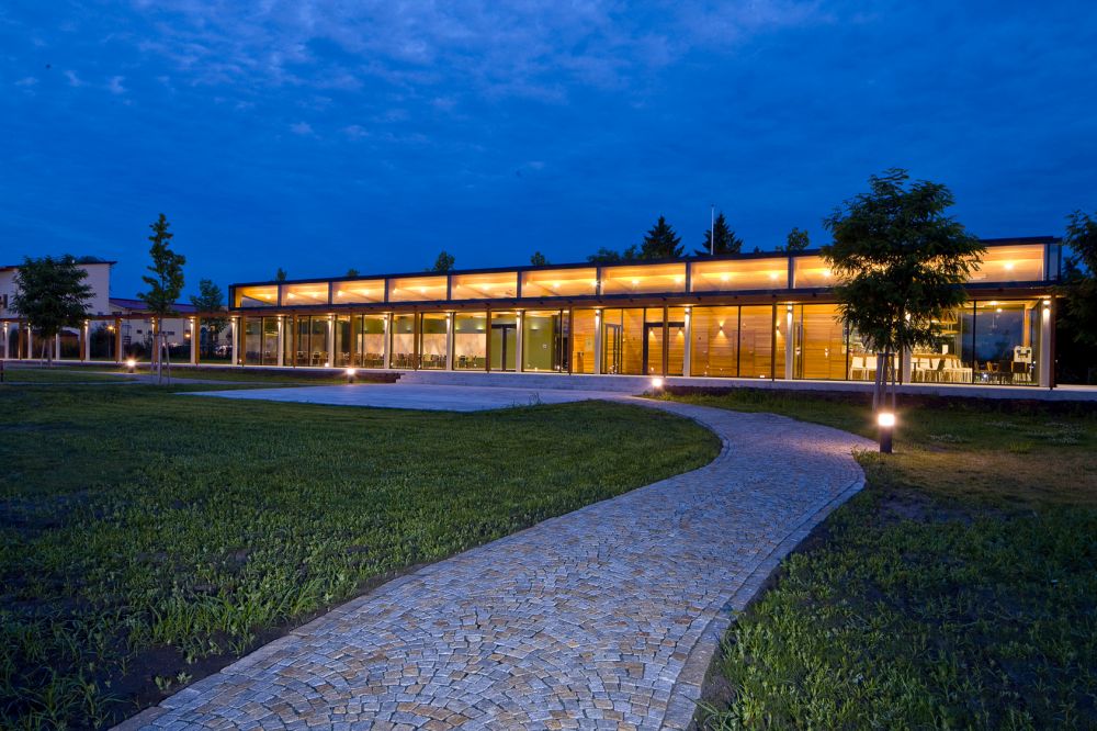 Stavbu kongresového centra jsme pojali jako jednoduchou dřevěnou strukturu. Provozně navazuje na stávající hotel, komponována je jako součást nového parku. Svojí pergolou podél jeho severního okraje propojuje hotel s lázeňskou kolonádou. Lapidární, ze tří stran prosklený prostor ležatého dlouhého hranolu, po vzoru zámecké saly terreny orientovaný do parku, je uvnitř doplněn pouze eliptickou obslužnou buňkou, vloženou mezi kongresový sál s foyer a kavárnu.