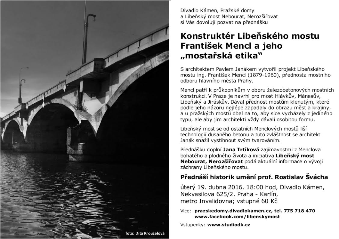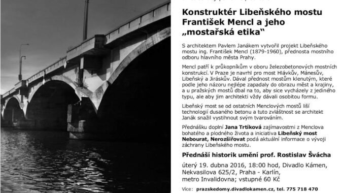 Přednášku doplní Jana Trtíková zajímavostmi z Menclova bohatého a plodného života a iniciativa Libeňský most Nebourat, Nerozšiřovat podá aktuální informace o vývoji záchrany Libeňského mostu.