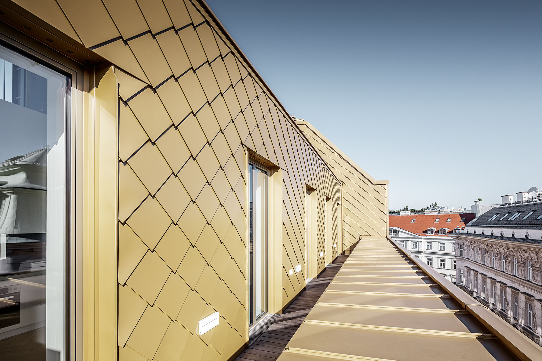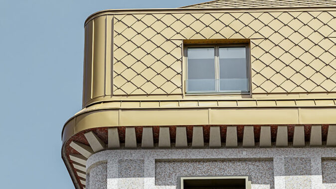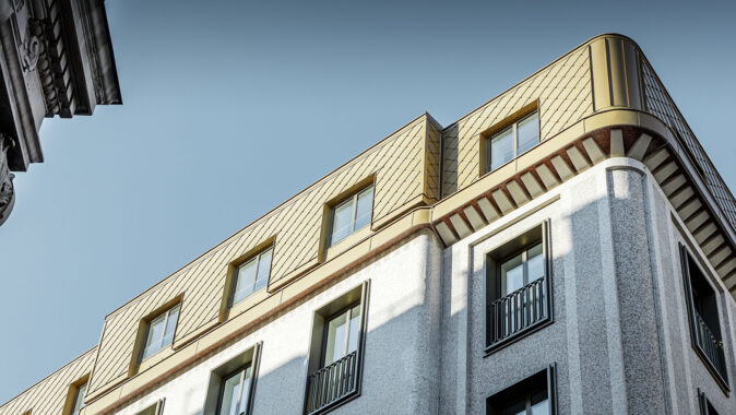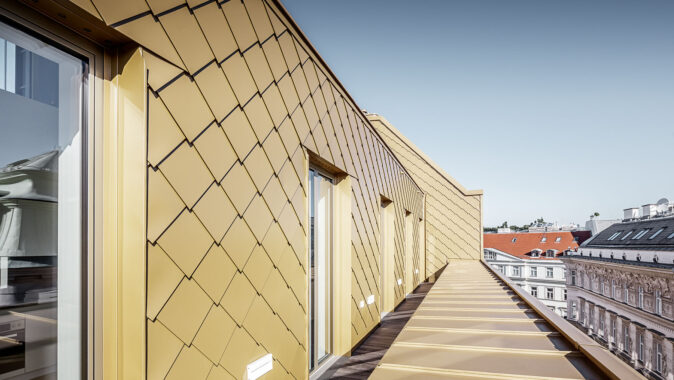 Přímo v centru rakouské metropole Vídně, na ulici Brandstätte, stojí historický dům, který docela nedávno změnil svoji podobu, a dostal zcela nový, nevšední kabát. Impozantní dojem vyvolává zvláště zlatá hliníková střecha, která se ve slunečních paprscích působivě blyští. Tak dokonalého optického efektu bylo možné dosáhnout jen díky kvalitnímu materiálu – hliníkovým šablonám PREFA v metalické barvě.