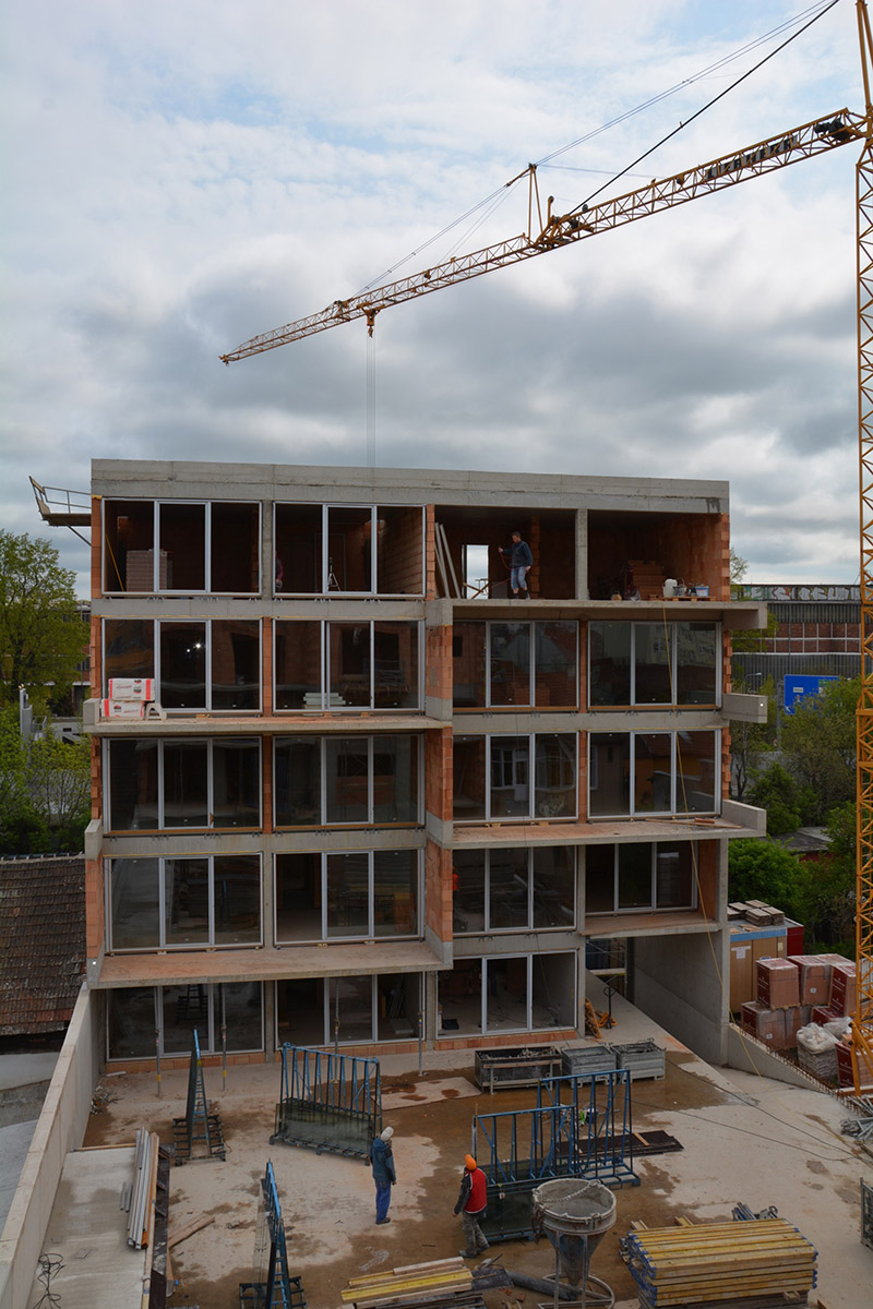 Nemůžu si pomoct, ale hrubá stavba neodpovídá vizualizaci. Na první pohled není dodržen rozdílný počet pater a členění oken. To, co je na projektu zajímavé a tvoří výraz stavby, je provedením hrubé stavby výrazně znehodnoceno. A to je ještě otázka, co zhotovitel s takovýmhle přístupem udělá s balkóny a barevností fasády. Co na to autorský dohled?