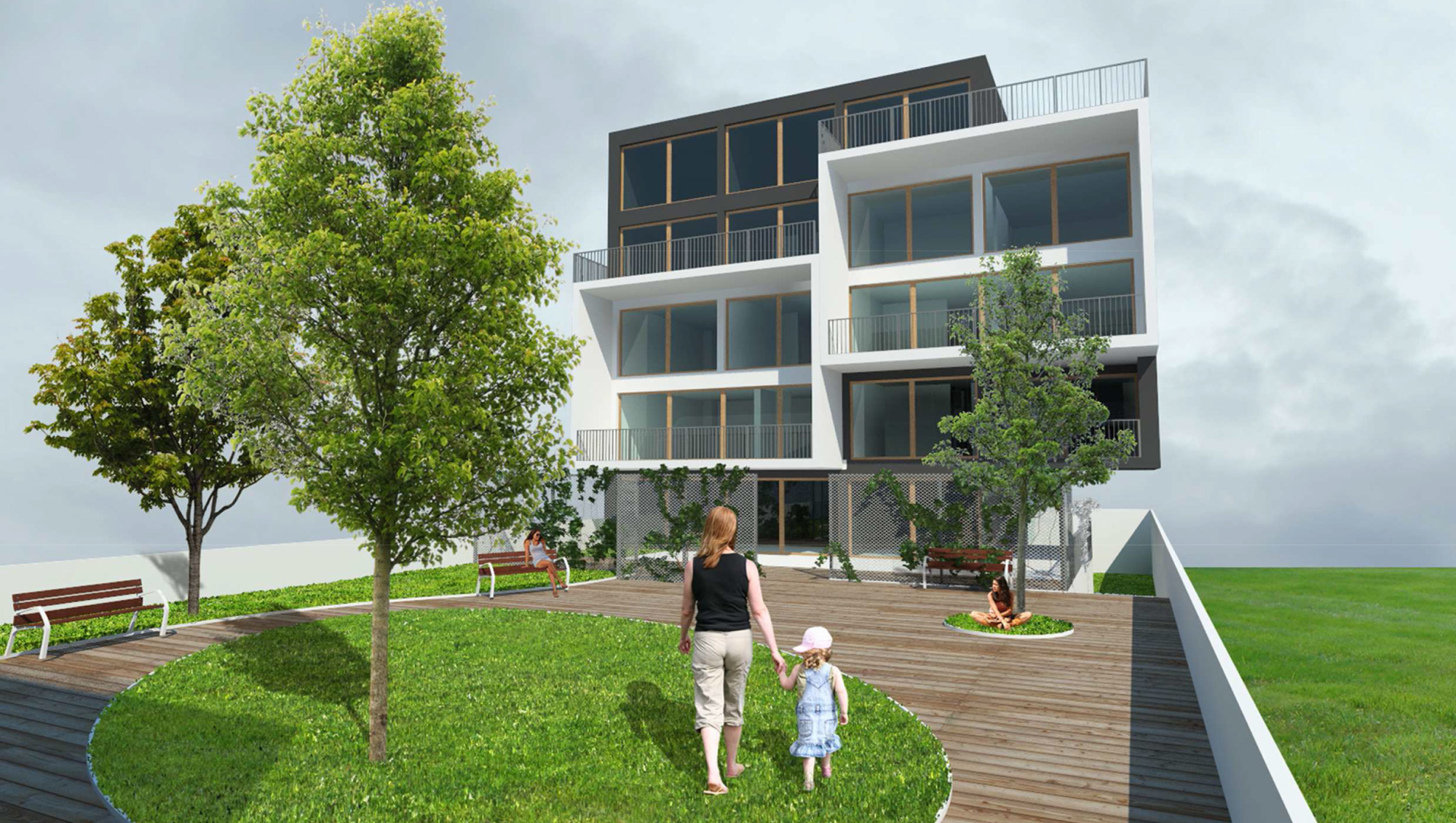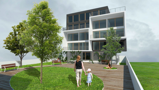 Mezi oběma bytovými bloky vznikne chráněný venkovní prostor se zahradními prvky. Samotné budovy pak budou spojeny podzemním podlažím se sklepy a 27 parkovacími místy.