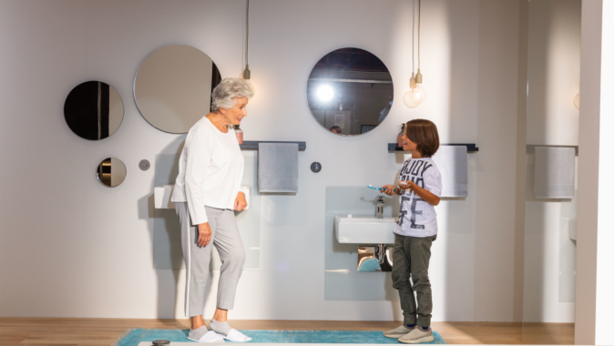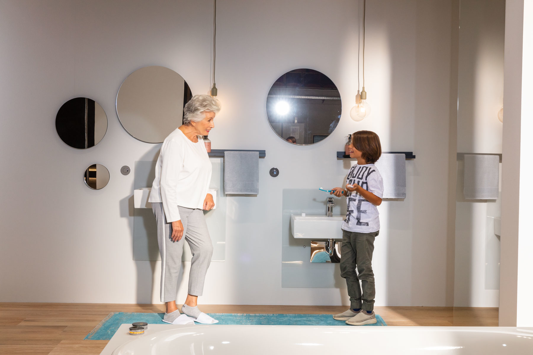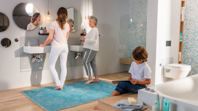 Při zařizování koupelny na míru všem generacím klademe důraz především na výrobky, které usnadňují člověku život. Všechny produkty by měly být moderní, technicky vyspělé, a přitom snadno použitelné. To se týká například elektronicky řízených vodovodních armatur u vany [http://bit.ly/35s91J2], které hlídají nastavení teploty a automaticky zastaví přítok vody při dosažení požadovaného množství. Pokud jde o design interiéru, cenným doplňkem jsou předstěnové instalační prvky. Zakryjí veškeré potrubí, rozdělují prostor a nabízejí možnost praktického zabudování polic nebo celých skříněk.