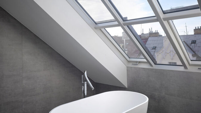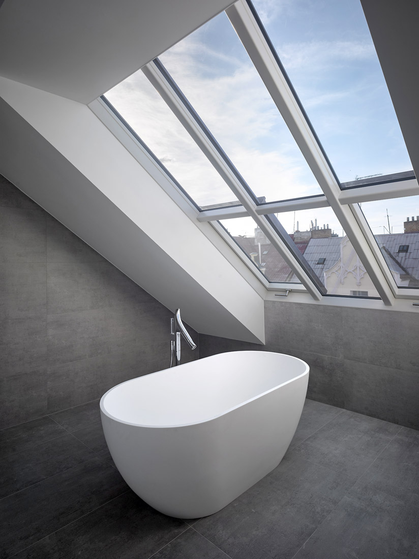 Pod střechami se dříve nežilo, půdy byly volné. Nyní zde bydlíme i pracujeme – a hodnotně prosvětlit, otevřít prostor starého podkroví v památkově chráněných zónách je oříšek, má to pevná pravidla. Dobře navrženému prosklení podkroví je pak přisuzována jedinečnost, luxus, velká porce romantiky a při současných technologiích a zasklení i celoroční tepelný komfort. Fotografie ilustruje, že ateliérové střešní okno dává koupelně právě ten prostor a právě tu jedinečnost. Takového výsledku se dá dosáhnout, i když je dům pod památkovým dohledem.