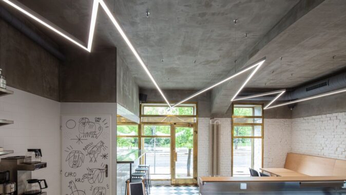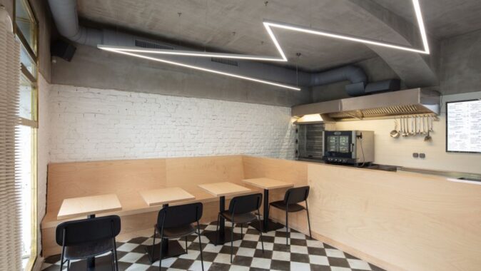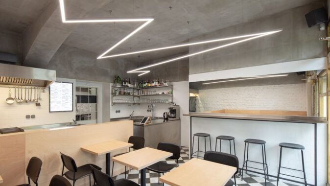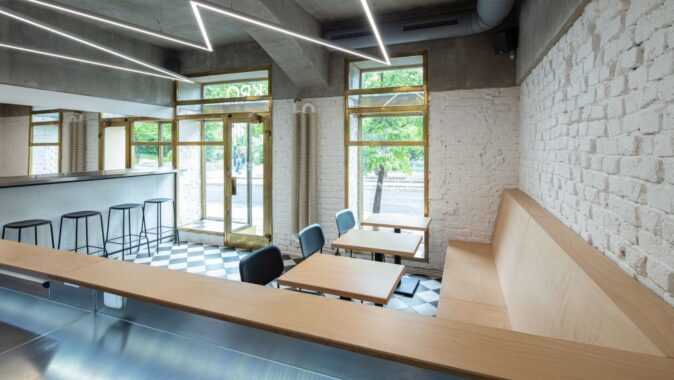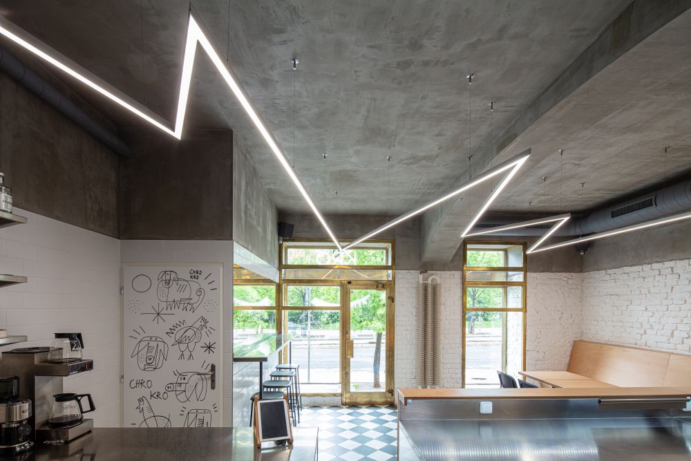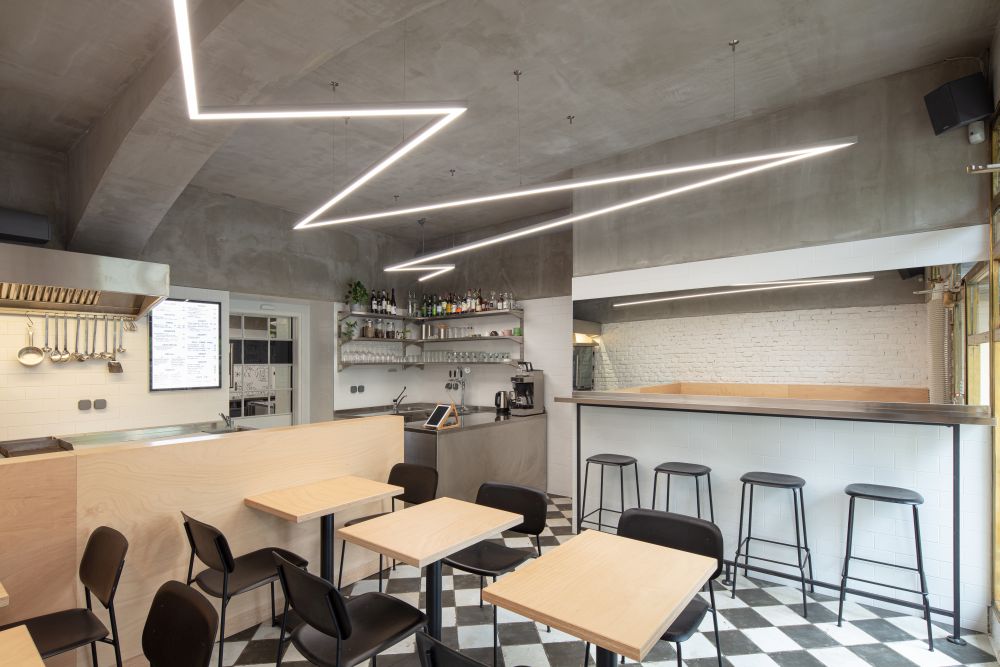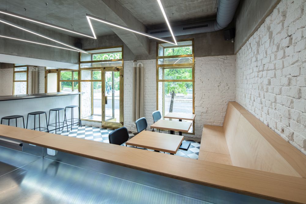 V průběhu projektu nakonec došlo k odstranění všech nejhorších pozůstatků původního interiéru, ale koncept řezu zůstal zachován. Navržená monochromatická vrstva uklidňuje a sceluje celý prostor, pod úrovní řezu se rozehrává kombinace módních, ale adekvátních materiálů. Na bíle natřené cihly – kromě podlahy jediný pozůstatek původního interiéru – svým rastrem navazuje keramický obklad. Jednoduchá překližková lavice plynule přechází v barový pult, za nímž se nachází otevřená kuchyně s barem. Vše se odehrává v jediné místnosti: prostor pro hosty definuje dřevo, obligátní nerez vymezuje obsluhující a výrobní část a vše propojuje námi navržené originální svítidlo.