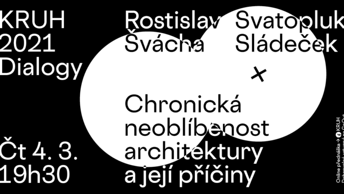 První přednáška v jarní části cyklu otevře dialog jednoho z nejvýznamnějších českých historiků architektury Rostislava Šváchy a svébytného architekta Svatopluka Sládečka, který tvoří převážně ve Zlínském kraji a jehož stavby se nazývají tzv. figurkativní architekturou. Jejich vzájemný rozhovor na téma Chronická neoblíbenost architektury a její příčiny se zaměří na neoblíbenost moderní architektury, na smysl architektury a její srozumitelnost v současné době. Večer bude doprovázen ukázkami vybraných staveb nejen Svatopluka Sládečka.