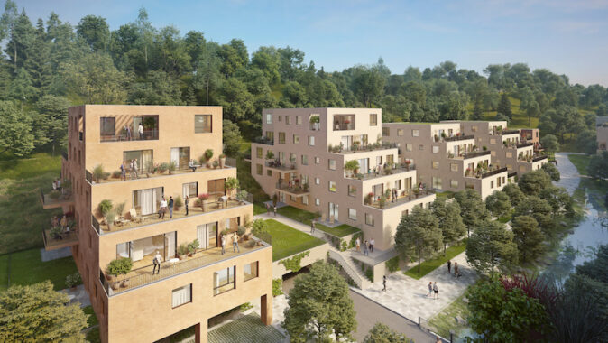 apartmánový dům s vysunutými boxy a šikminami. Ten by měl být dokončen jako