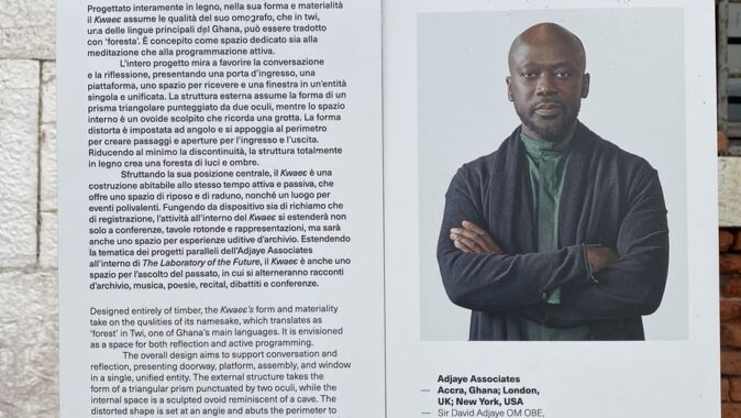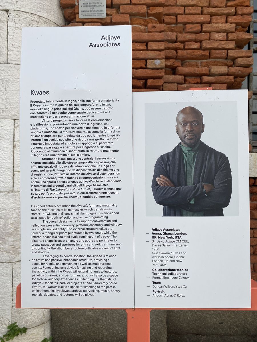 Výstava Kwaeε, která je umístěna před centrálním pavilonem Arsenale v rámci 18. mezinárodní výstavy architektury, jejímž kurátorem je Lesley Lokko, může být chápána jako tematické rozšíření Adjayeho paralelní výstavy v Giardini, která zahrnuje Adjayeho vyprávěný a produkovaný film s názvem „Lost Knowledge Systems“ a multimediální dokumentaci devíti relevantních projektů. V duchu neustálé obnovy je forma navržena jako modulární, prefabrikovaná struktura, kterou lze znovu použít a přemístit na jiná místa po celém světě.[1]