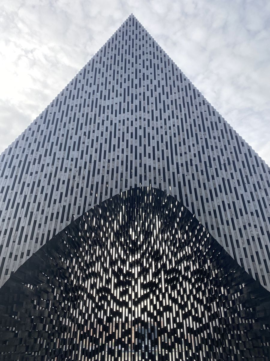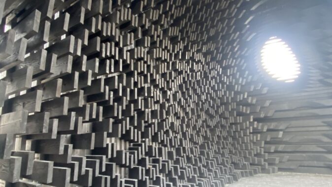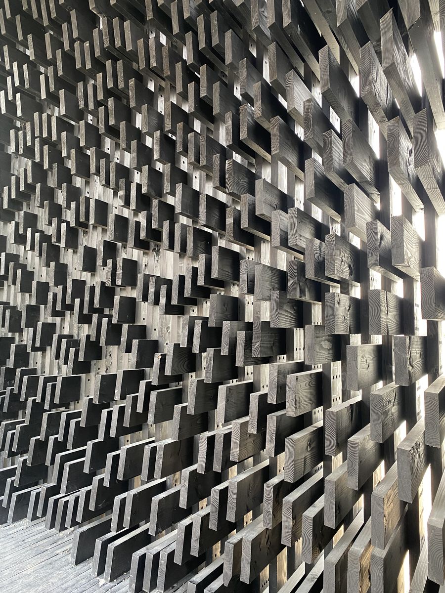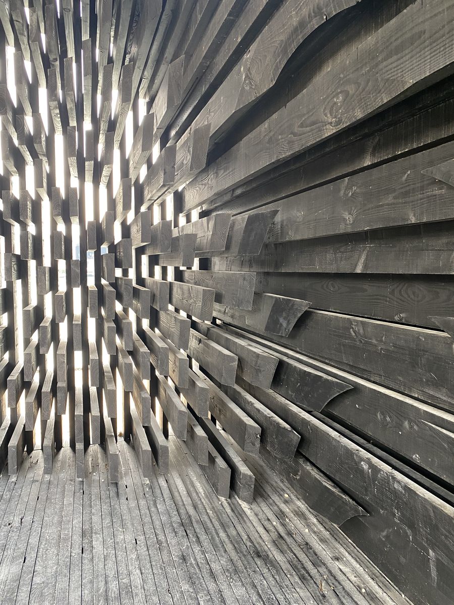 Třináctimetrová socha má podobu trojúhelníkového hranolu a spojuje dveře, plošinu, shromaždiště a okno do jediného, jednotného celku. Vnitřní prostor skulptury vzniká jako deformovaný ovoid, který proráží formu a vytváří zastřešený průchod pro vstup a výstup; dvě oculi jsou umístěny na severní a jižní fasádě. Minimalizací pevných povrchů kultivuje celodřevěná konstrukce les světla a stínu a vytváří pohlcující jeskynní atmosféru.