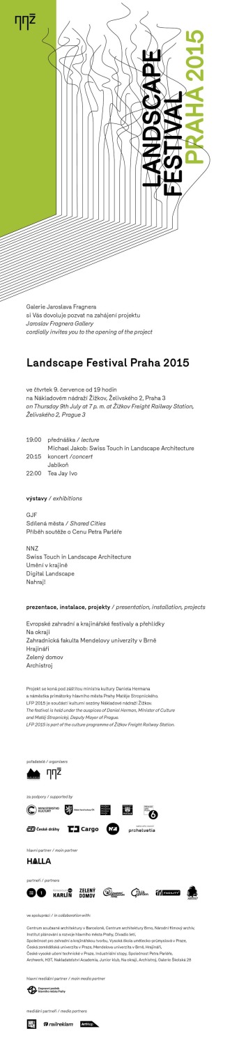 Úspěšný Landscape festival Praha 2015 pokračuje letos třetím ročníkem. Návštěvníci se mohou na Nákladovém nádraží Žižkov opět těšit na výstavy věnované veřejnému prostoru a krajinářské tvorbě i site specific instalace na železničních vagonech. LFP 2015 bude zahájen dnes  9. července a potrvá až do 27. září, stejně jako minulý rok bude vstupné zdarma. Dvě výstavy budou po celé léto také v prostorách Galerie Jaroslava Fragnera, která festival pořádá.
