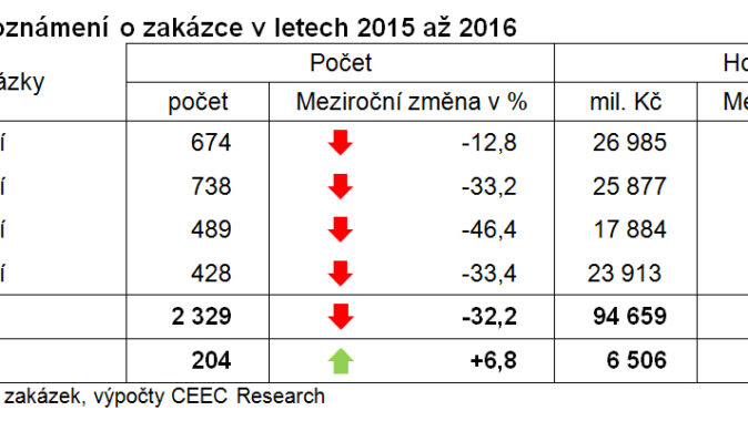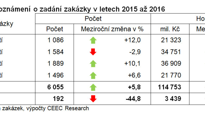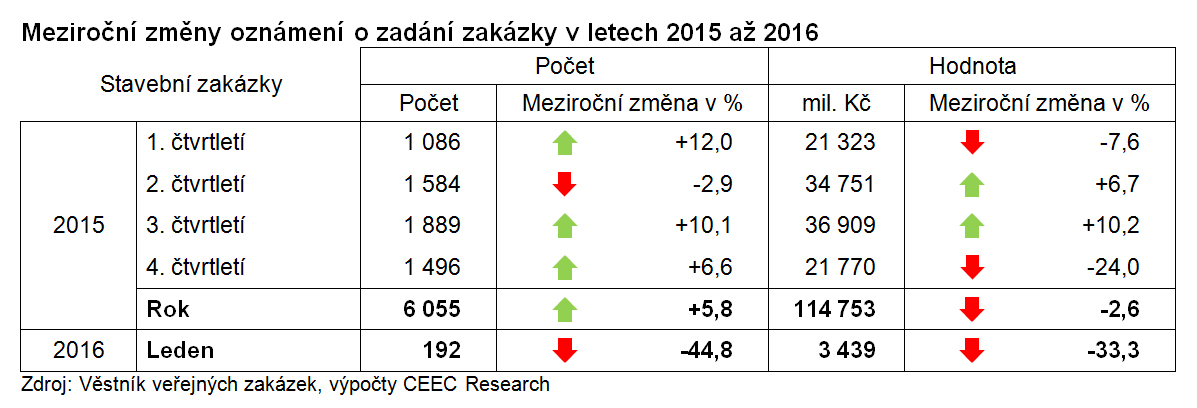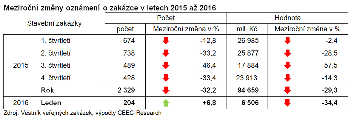 V prvním měsíci roku 2016 vypsali veřejní investoři 204 výběrových řízení v celkové hodnotě 6,5 miliardy korun. V meziročním srovnání jde sice z hlediska objemu zakázek o výrazný třetinový pokles (34,4 procenta), na druhou stranu ale jejich počet zaznamenal oproti srovnatelnému období minulého roku nárůst (6,8 procenta), a stal se tak rekordním lednovým počtem zakázek za posledních pět let, tedy za celou dobu sledování. „Pokles hodnoty oznámených zakázek byl ovlivněn vypsáním dvou velkých zakázek v lednu 2015 v celkové hodnotě cca 4 miliardy korun (ŘSD-D3 a Technická správa hl. m. Prahy-Libeňský most). Při modelovém odpočtu těchto zakázek by hodnota oznámených zakázek v lednu 2016 vzrostla o 10 procent,“ upřesňuje Jiří Vacek, ředitel analytické společnosti CEEC Research.