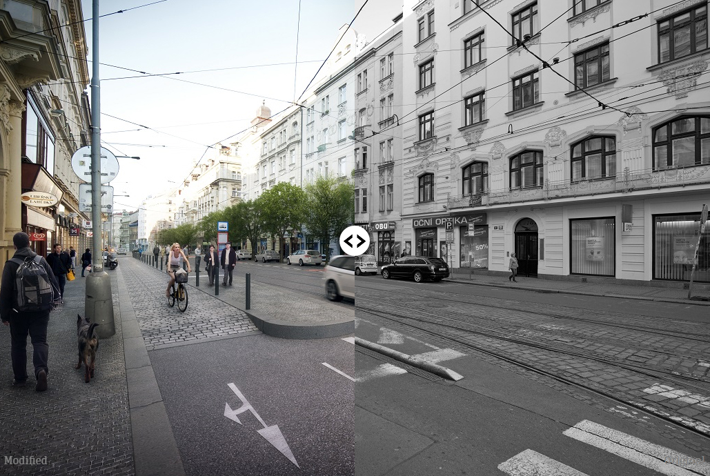 Tady se snad někdo zbláznil. Na prvním obrázku končí cyklostezka z ničeho nic na konci křižovatky, na druhém jede cyklista po čemsi mezi chodníkem a nástupištěm a auto po kolejích a k tomu jsou před cyklistou dva jízdní pruhy …