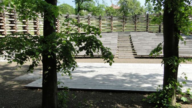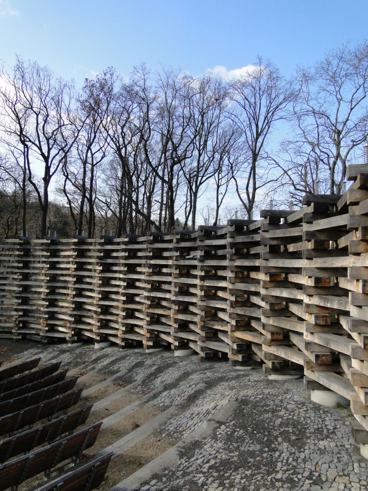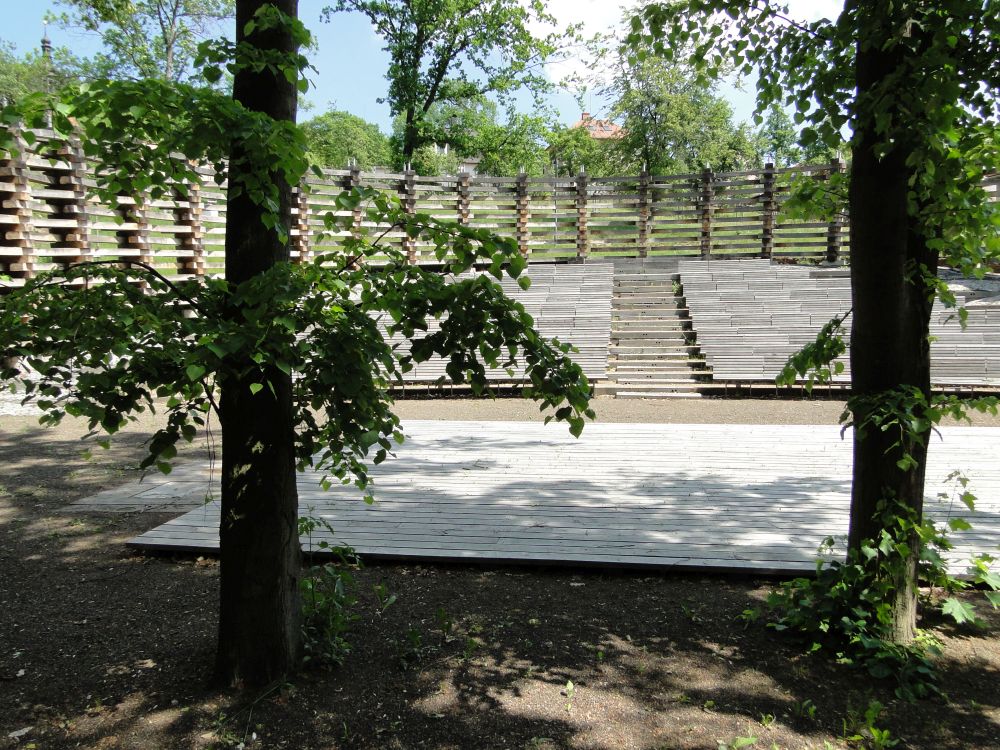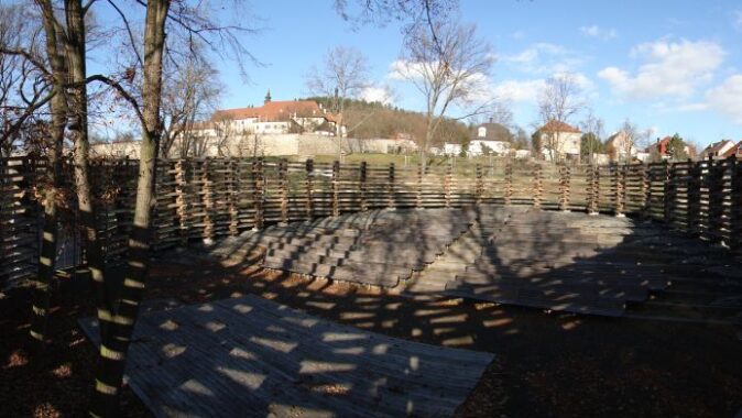 krajině. Dubová ohrada z masivních pražců vymezuje oválný prostor pro 300