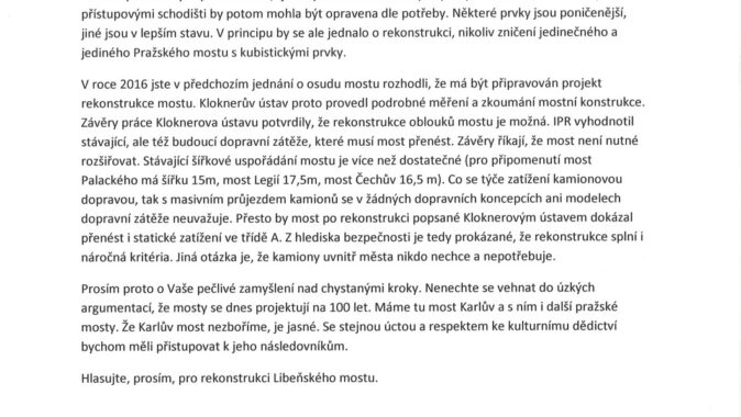 Lež a účelová manipulace s fakty se bohužel stala permanentní součástí veřejného života. Žádám Vás proto, abyste zodpovědně posoudili váhu argumentů a nepodléhali tlaku „jednoduchých a rychlých“ řešení, která se při podrobnějším pohledu nejeví zdaleka tak snadná, rychlá, levná a neriziková. Libeňský most od architekta Pavla Janáka a konstruktéra Františka Mencla je nejmladším z komponované série Pražských mostů a jeho jedinečnost je nesporná.