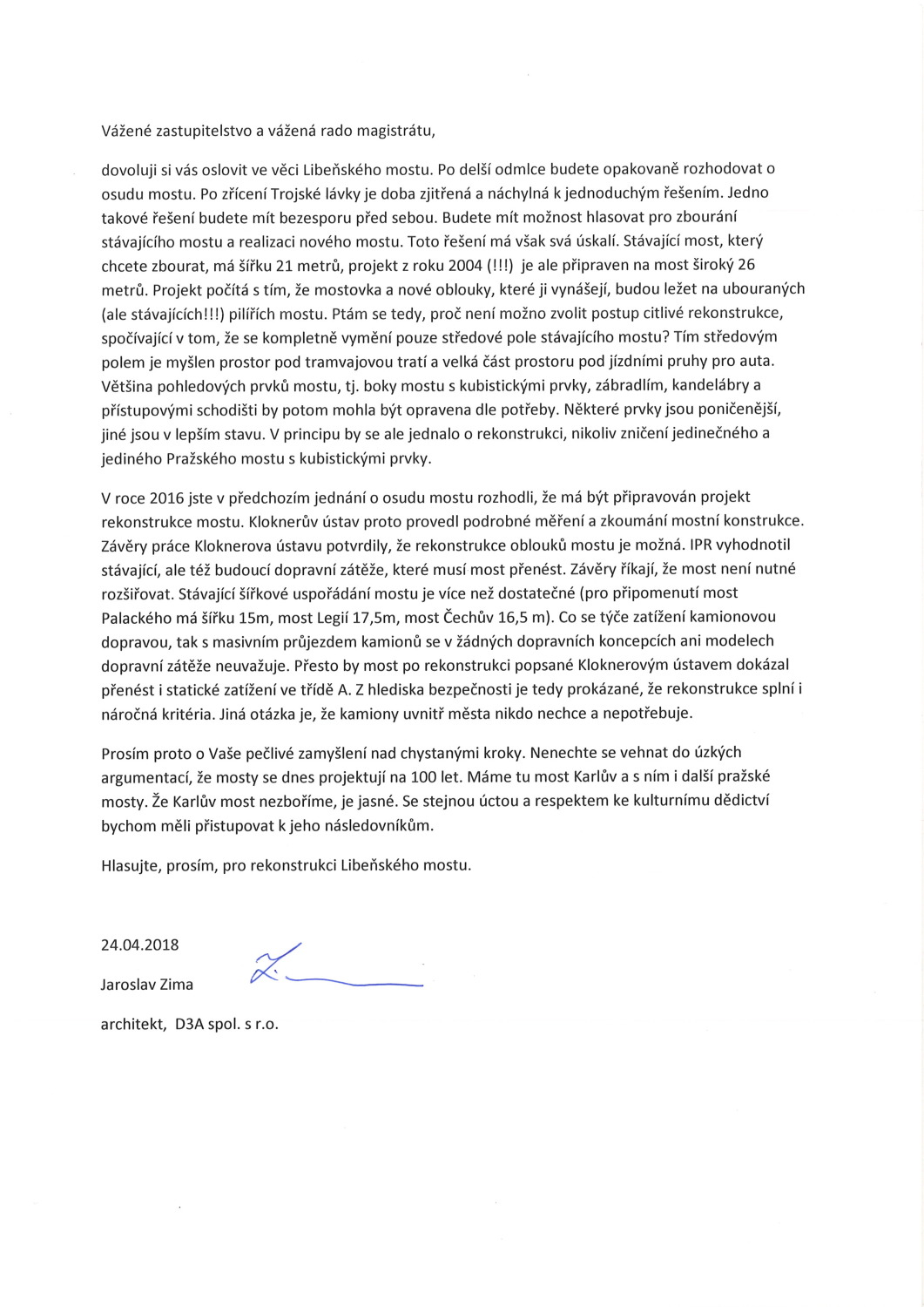 a dopisu architekta Jaroslava Zimy k hlasování Rady hlavního města Prahy o bourání Libeňského mostu.