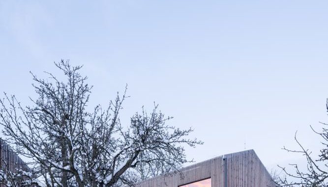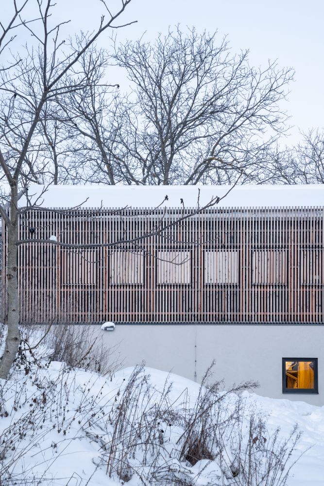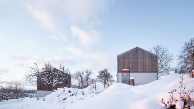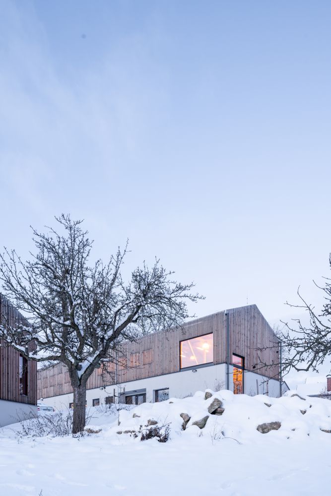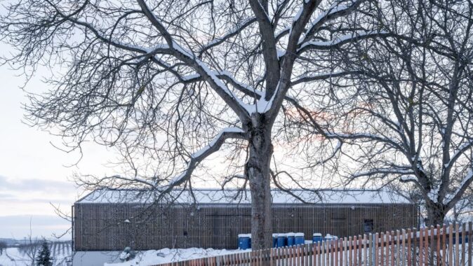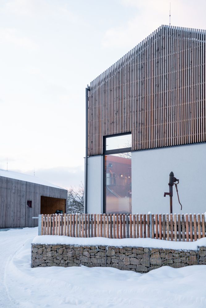 Rozhodli jsme se pro zachování stávajícího a osvědčeného urbanistického řešení. Trojúhelníkové uspořádání půdorysných stop domů reaguje na potřeby provozu, orientaci ke světovým stranám a průhledy do krajiny. Změna typologie si vyžádala aktualizaci hmoty, která pracuje s výškovými rozdíly terénu. Lihovar využívá jeho konfigurace pro technologický postup – přípravu ovoce v patře, nasávání a výpal kvasu v přízemí. Vysazení stromu uprostřed dává vyniknout centrálnímu dvoru a dodává prostoru příjemnou energii. V přízemí jsme navrhli železobetonový monolit; v patře subtilní fošinkovou dřevostavbu.
