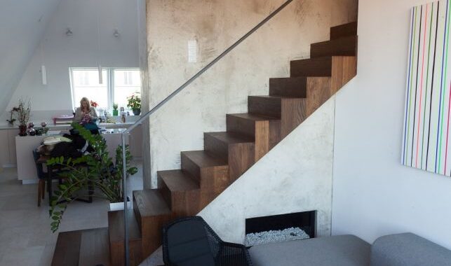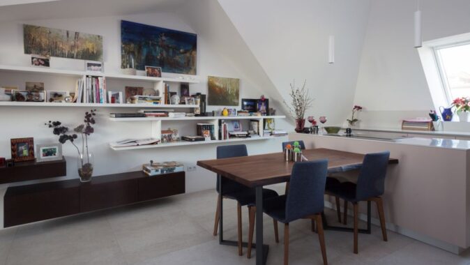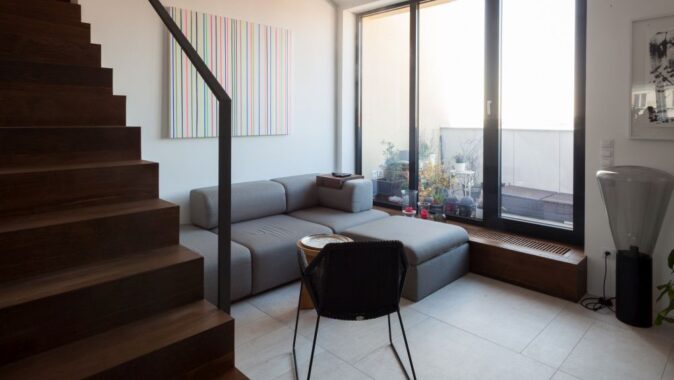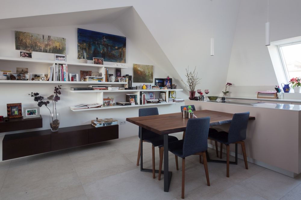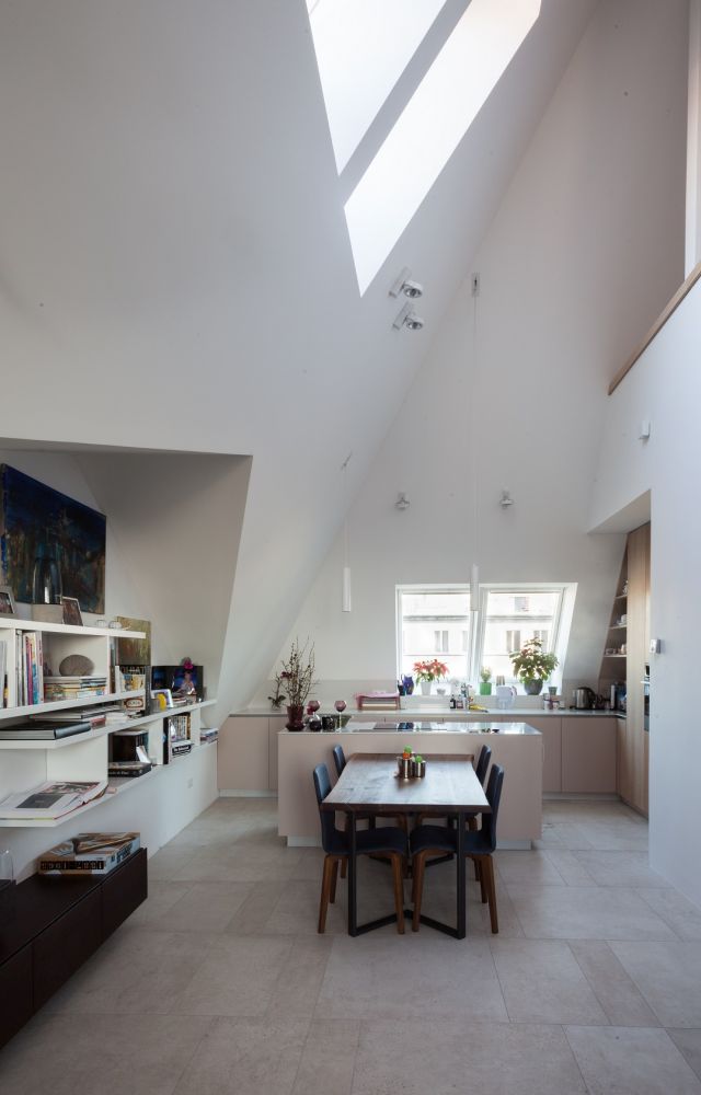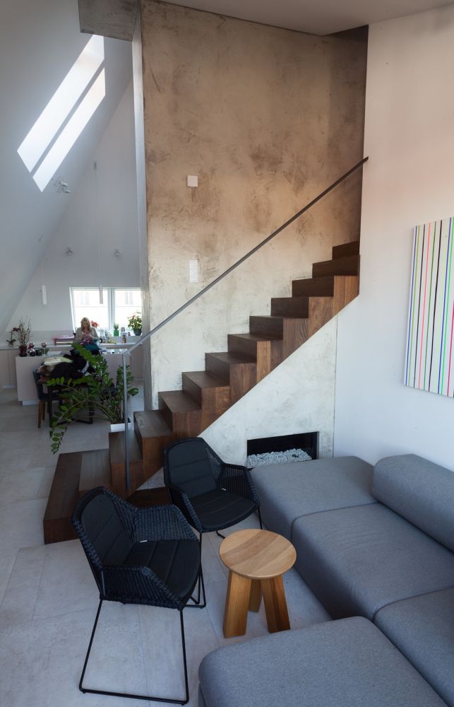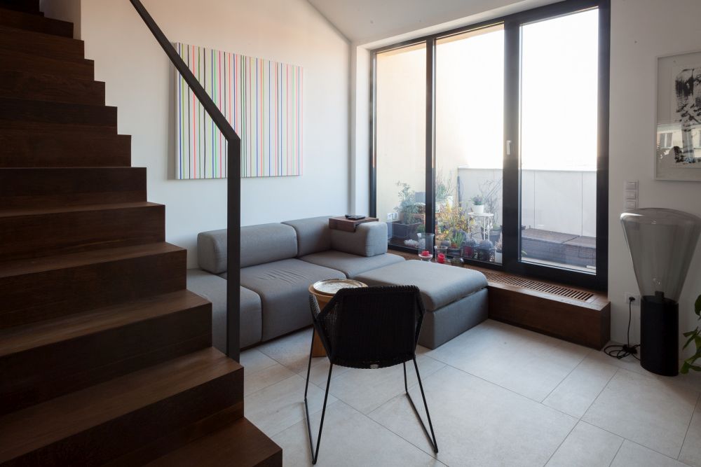 Základní koncept spočíval ve vytvoření vysokého vzdušného prostoru spodní části s předsíní, kuchyní a obývacím pokojem, ze kterého vede přístup na terasu s výhledem na Žižkovskou věž a Vítkov. Patro s ložnicí a koupelnou je naopak klidné a útulné. Prostory spolu komunikují prostřednictvím vloženého schodiště, které spolu s navazujícím pódiem tvoří výrazný dřevěný prvek obývacího prostoru. Pódium je řešeno účelně, slouží jako vstupní schod na terasu a je do něj zasazena sedací souprava na míru, která může sloužit jako klasické lůžko. Celou spodní část sjednocuje světlá dlažba. Stejně prakticky je navržen i kuchyňský prostor s pracovními deskami z tvrzeného umělého kamene. Fošny masivního dubového stolu jsme vybírali před jeho výrobou. Výrazný prvek představuje také nika s knihovnou, jejíž police může sloužit jako pracovní stolní deska.