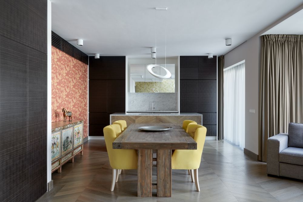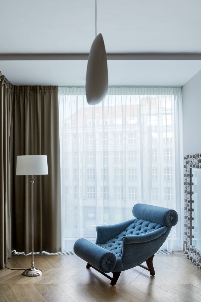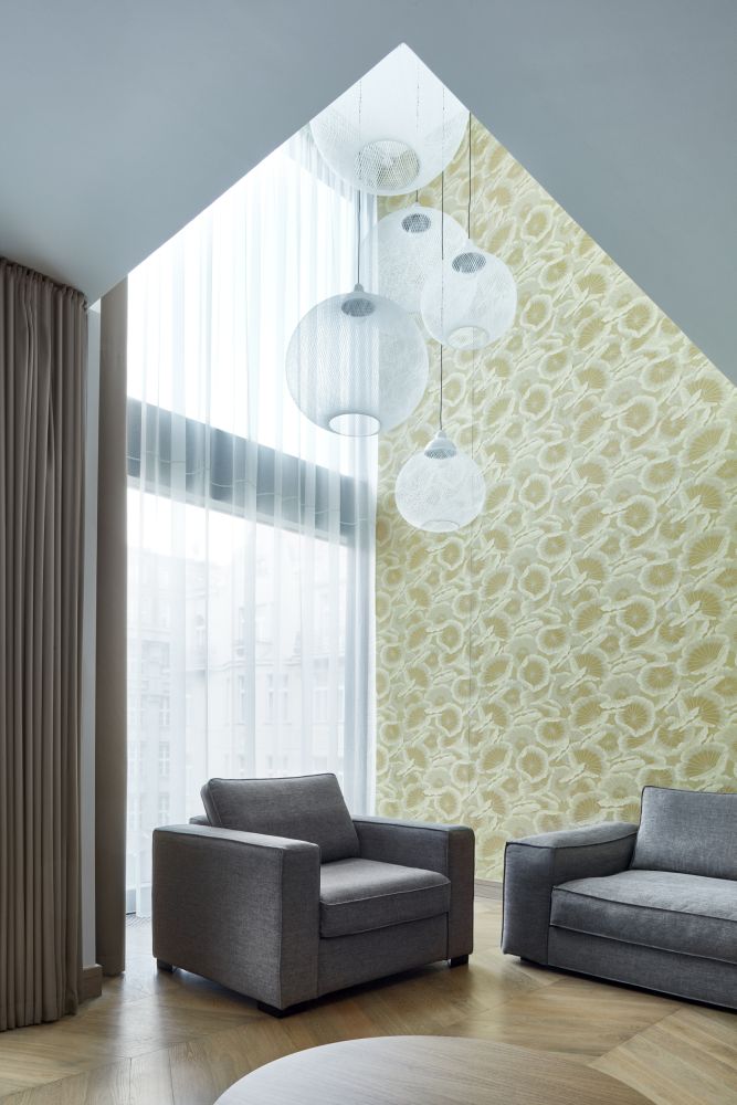 Zároveň bylo třeba do interiéru zakomponovat sbírkové předměty, které majitel bytu vlastní. Návrh se tedy snažil pro každý z předmětů navodit pomocí tematické tapety atmosféru, kterou daný předmět potřebuje. Díky tomu je interiér různorodý, ale zároveň ho spojují opakující se motivy a technika práce s detailem. Jedním z vysněných předmětů interiéru bylo lehátko Adolfa Loose od firmy Modernista.