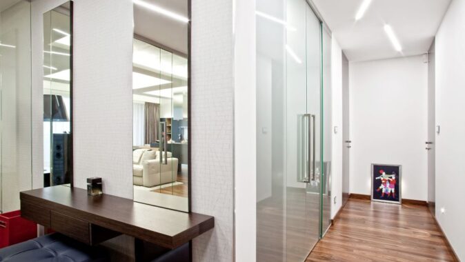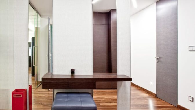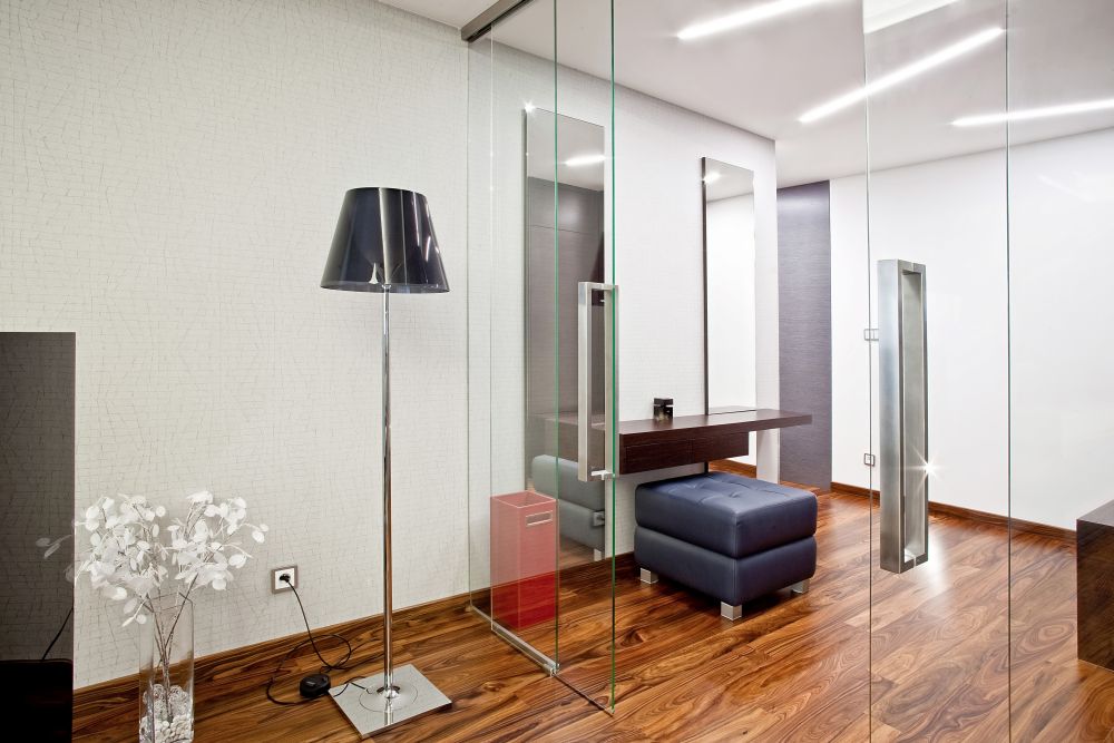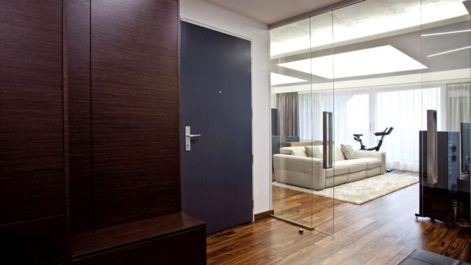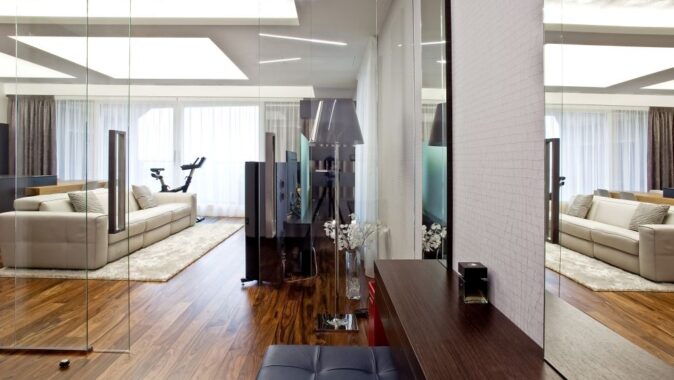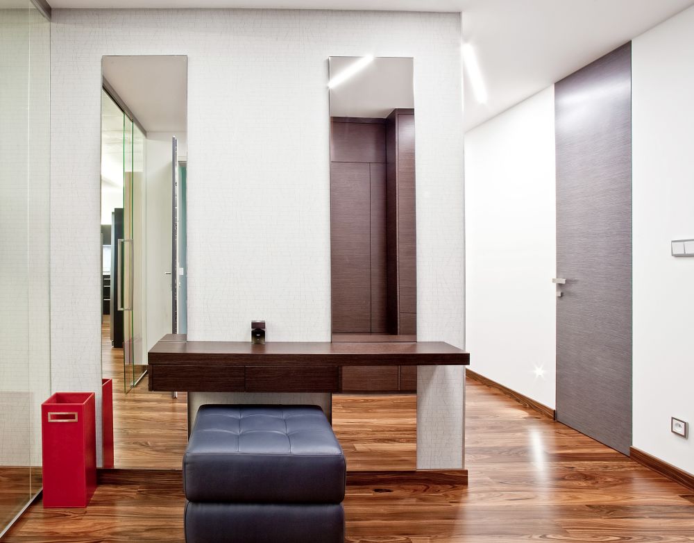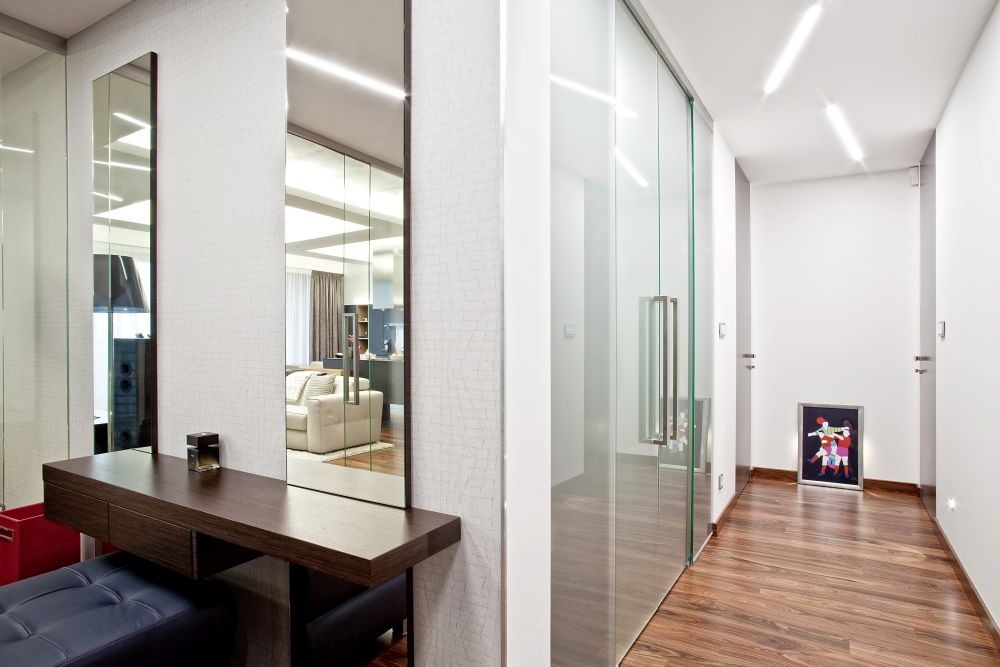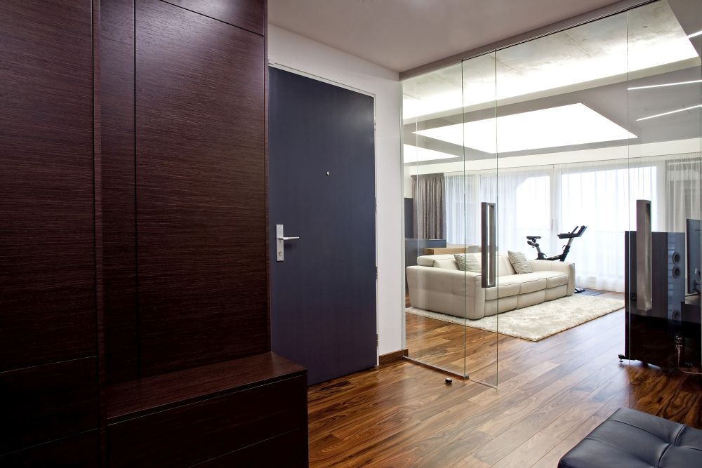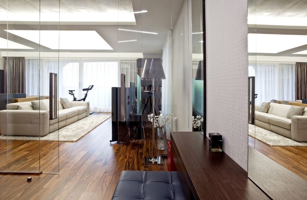 Byt je navržen v pánském stylu – z prostorné haly se vchází do ostatních místností. Velkorysá kuchyně s varným ostrovem, který plynule přechází v jídelní stůl, je propojena se společenskou zónou, kde jsme navrhli televizní stěnu. V bytě se dále nachází ložnice, šatna, pokoj pro hosty a koupelna s oddělenou toaletou a prádelnou. Díky kvalitně provedeným betonovým stropům jsme je přiznali v interiérech v kombinaci se sádrokartonovými podhledy s velkoformátovými barrisolovými světly. V celém bytě je položena podlaha z palisandru.
