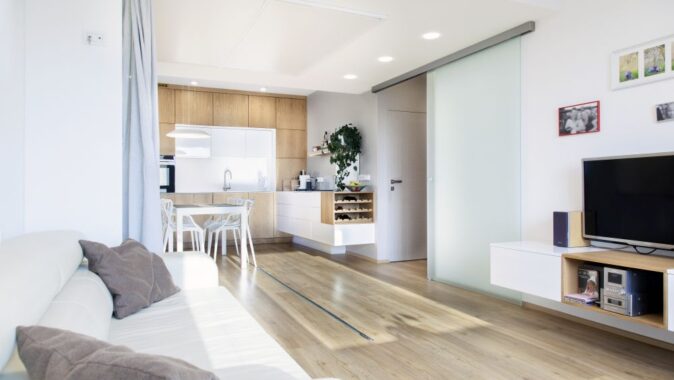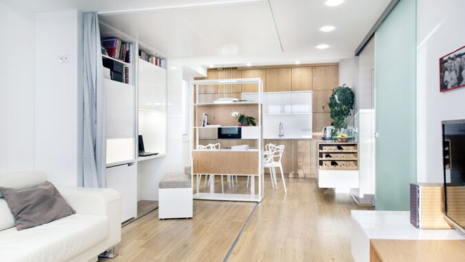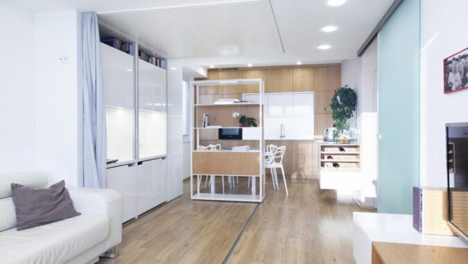 Zvednutím postele pomocí elektrického mechanismu do sníženého podhledu je přes den obývací pokoj dostatečně prostorný, což umožnilo umístit sem i malou domácí pracovnu. Další mobilním vybavením je nábytkový úložný díl, který se posouvá ve vodicích lištách umístěných v podlaze. Tím se pak dá podle potřeby měnit poměr velikosti obývací a jídelní části. Nosnou konstrukci mobilního úložného dílu tvoří prostorový rám složený ze stojatých průběžných sloupků. Vybavení bytu doplňuje atypický nábytek kuchyně a obývacího pokoje.