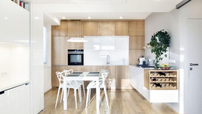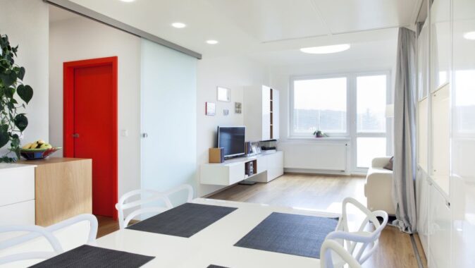 bytu 2+kk jsme do hlavního obytného prostoru vložili několik funkcí: kuchyni,