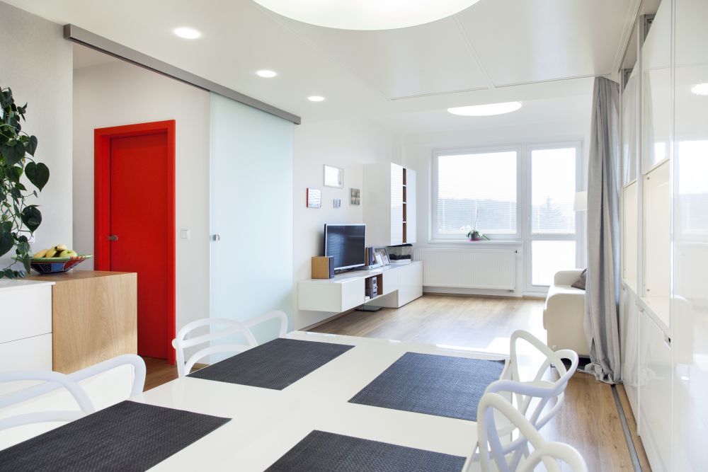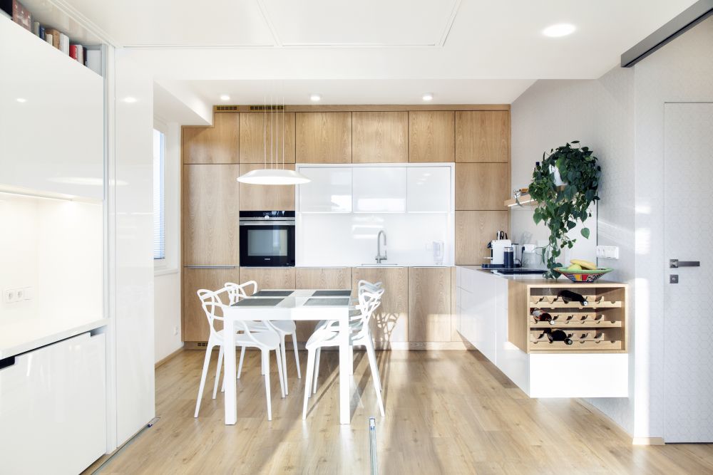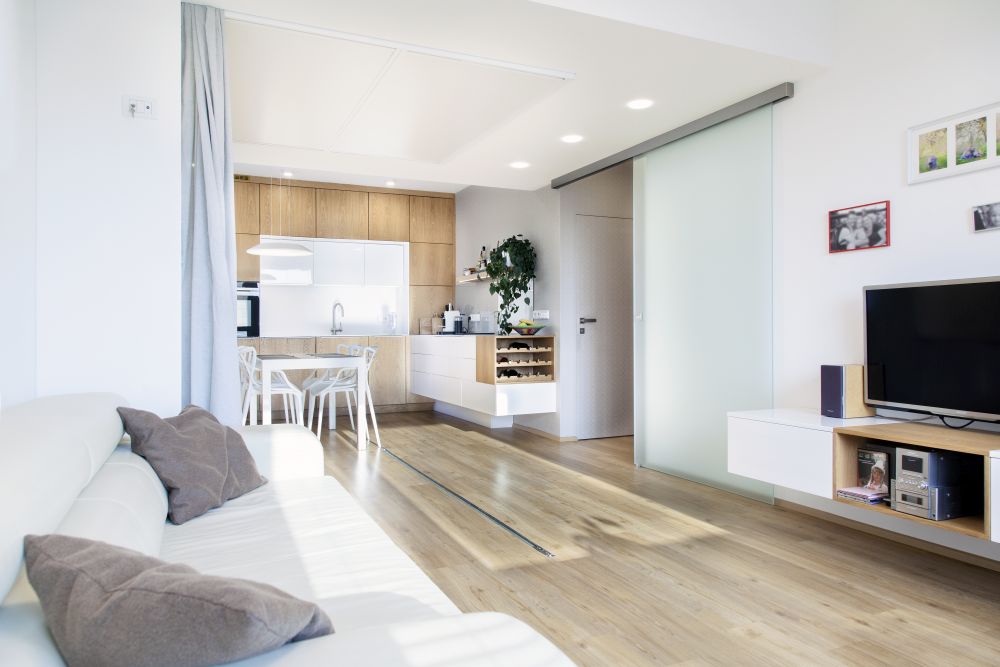 bytu 2+kk jsme do hlavního obytného prostoru vložili několik funkcí: kuchyni,