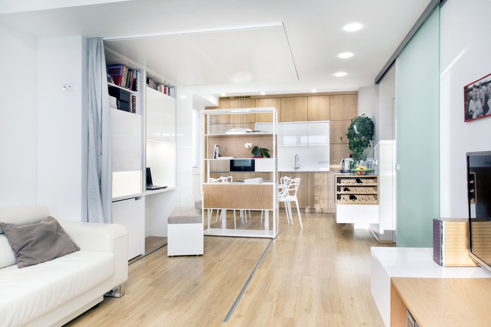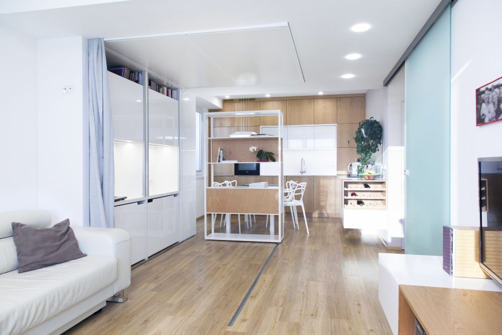 Zvednutím postele pomocí elektrického mechanismu do sníženého podhledu je přes den obývací pokoj dostatečně prostorný, což umožnilo umístit sem i malou domácí pracovnu. Další mobilním vybavením je nábytkový úložný díl, který se posouvá ve vodicích lištách umístěných v podlaze. Tím se pak dá podle potřeby měnit poměr velikosti obývací a jídelní části. Nosnou konstrukci mobilního úložného dílu tvoří prostorový rám složený ze stojatých průběžných sloupků. Vybavení bytu doplňuje atypický nábytek kuchyně a obývacího pokoje.