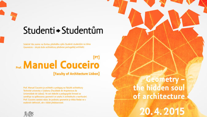 Čtvrtou přednášku cyklu Studenti studentům na téma Geometrie – skrytá duše architektury přednese portugalský architekt Prof. Manuel Couceiro. Cyklus běží pod záštitou proděkana pro zahraniční vztahy prof. Zdeňka Zavřela. Přednáška se koná v pondělí 20. 4. 2015 v 18.30 hodin v sále Gočár (155), Fakulta architektury ČVUT, Thákurova 9, Praha 6.