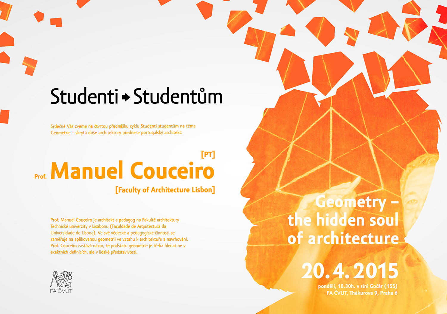 Čtvrtou přednášku cyklu Studenti studentům na téma Geometrie – skrytá duše architektury přednese portugalský architekt Prof. Manuel Couceiro. Cyklus běží pod záštitou proděkana pro zahraniční vztahy prof. Zdeňka Zavřela. Přednáška se koná v pondělí 20. 4. 2015 v 18.30 hodin v sále Gočár (155), Fakulta architektury ČVUT, Thákurova 9, Praha 6.