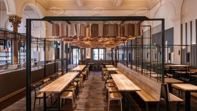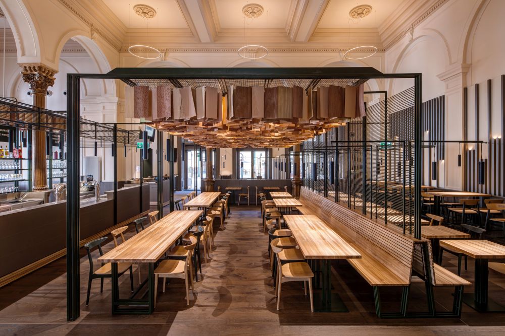 Pilsner Urquell se tak promítla i do designu interiéru. Prostor svou velikostí