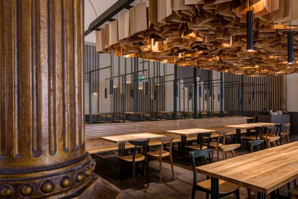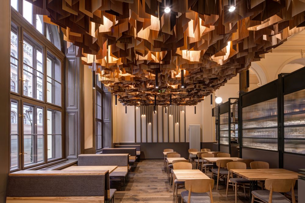 Velkorysost prostoru má své pro i proti, způsobuje akustické problémy. Nepříznivou akustiku jsme řešili kovovými konstrukcemi se zavěšenými dýhami, které brání šíření hluku, a navíc prostor zútulňují. Zvuk pohlcují také dřevěné obklady s polstrováním. Pohledy na historické stropy jsme zachovali.